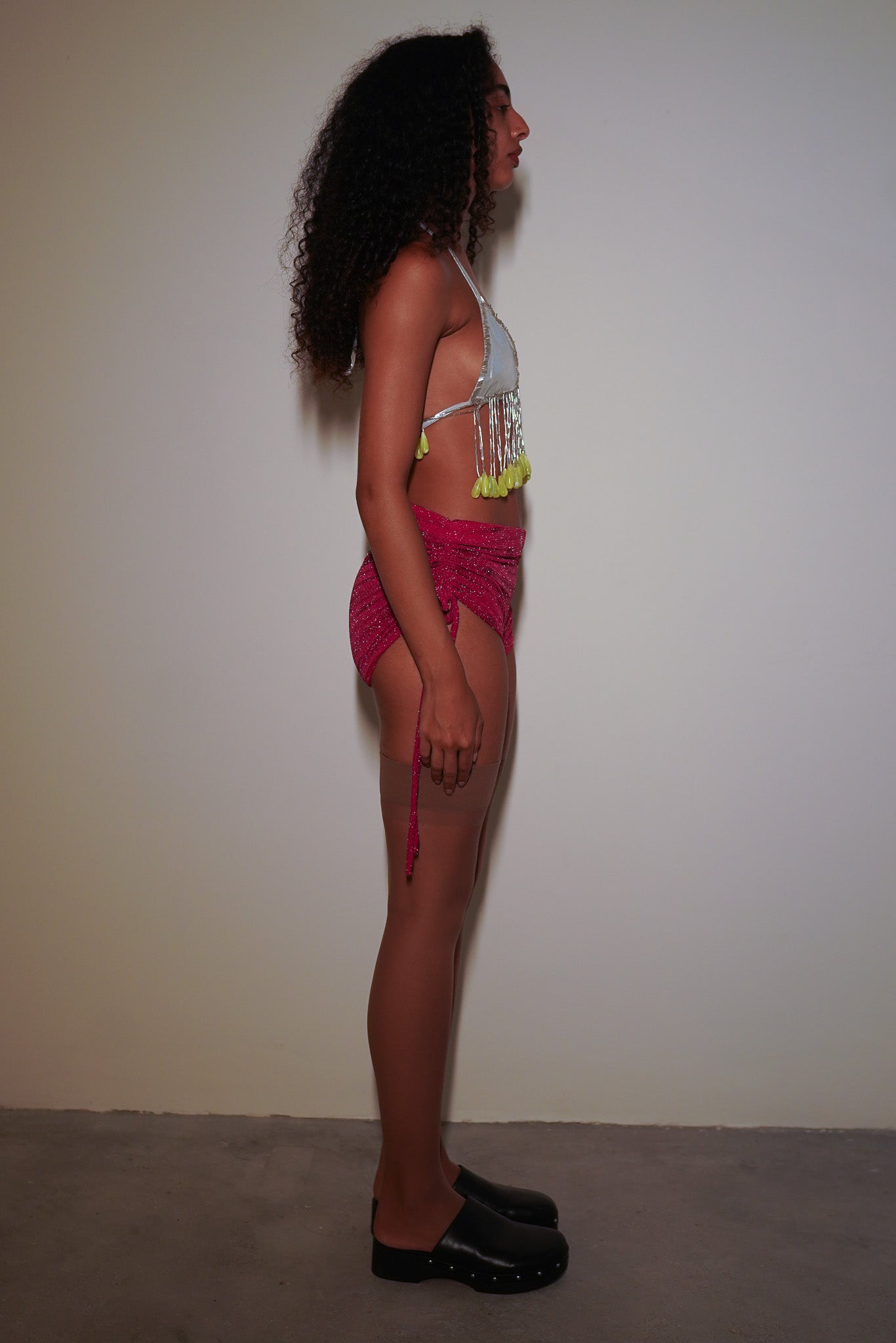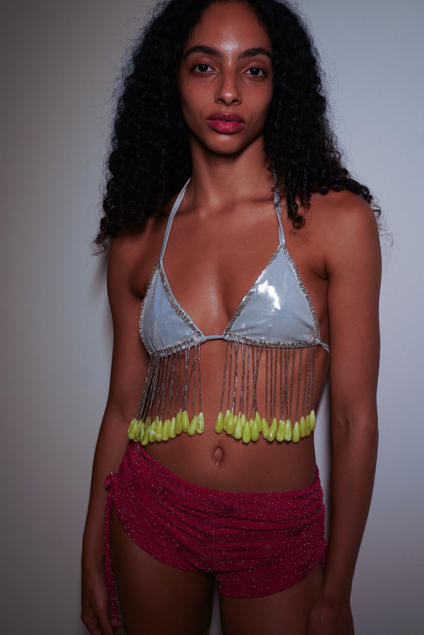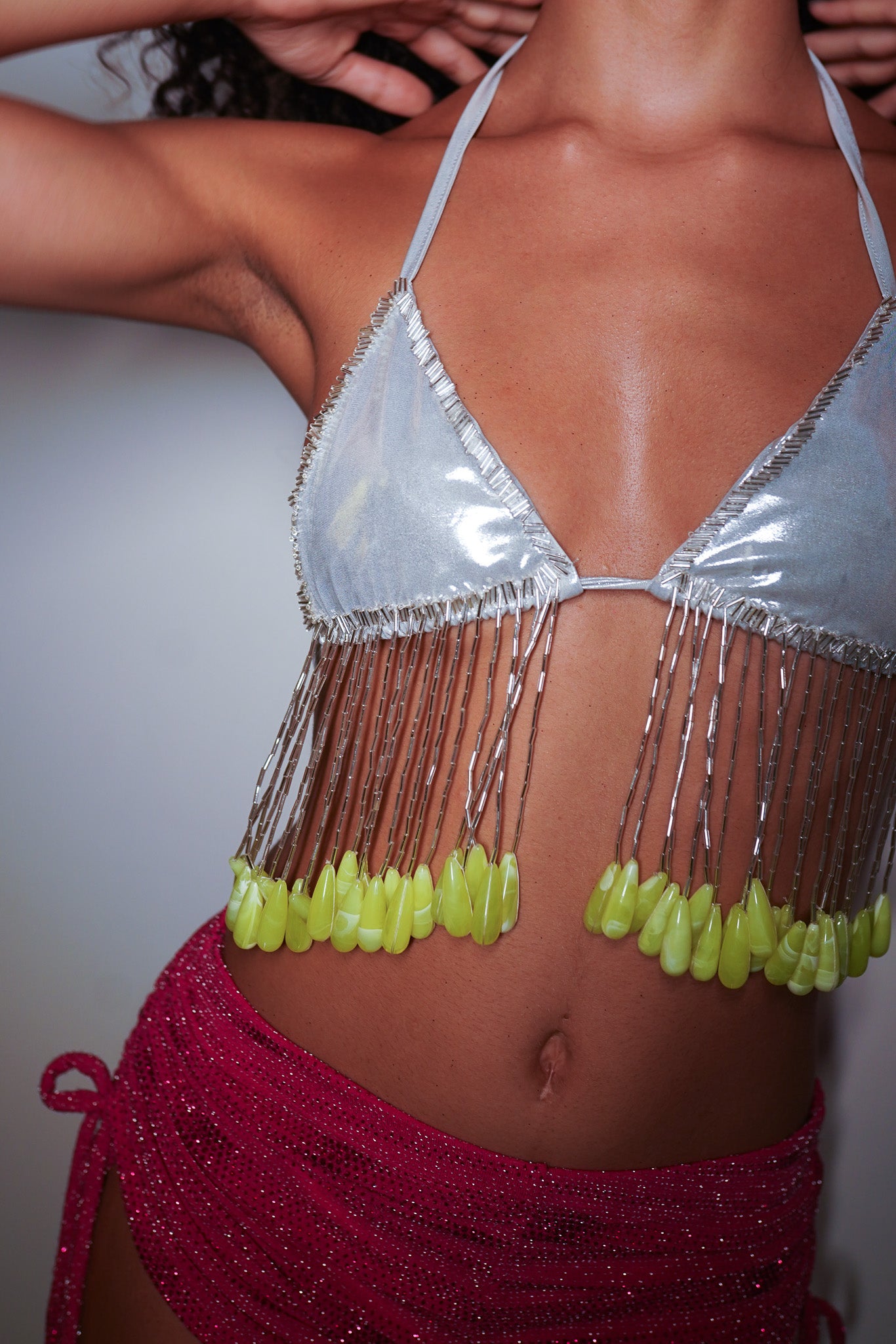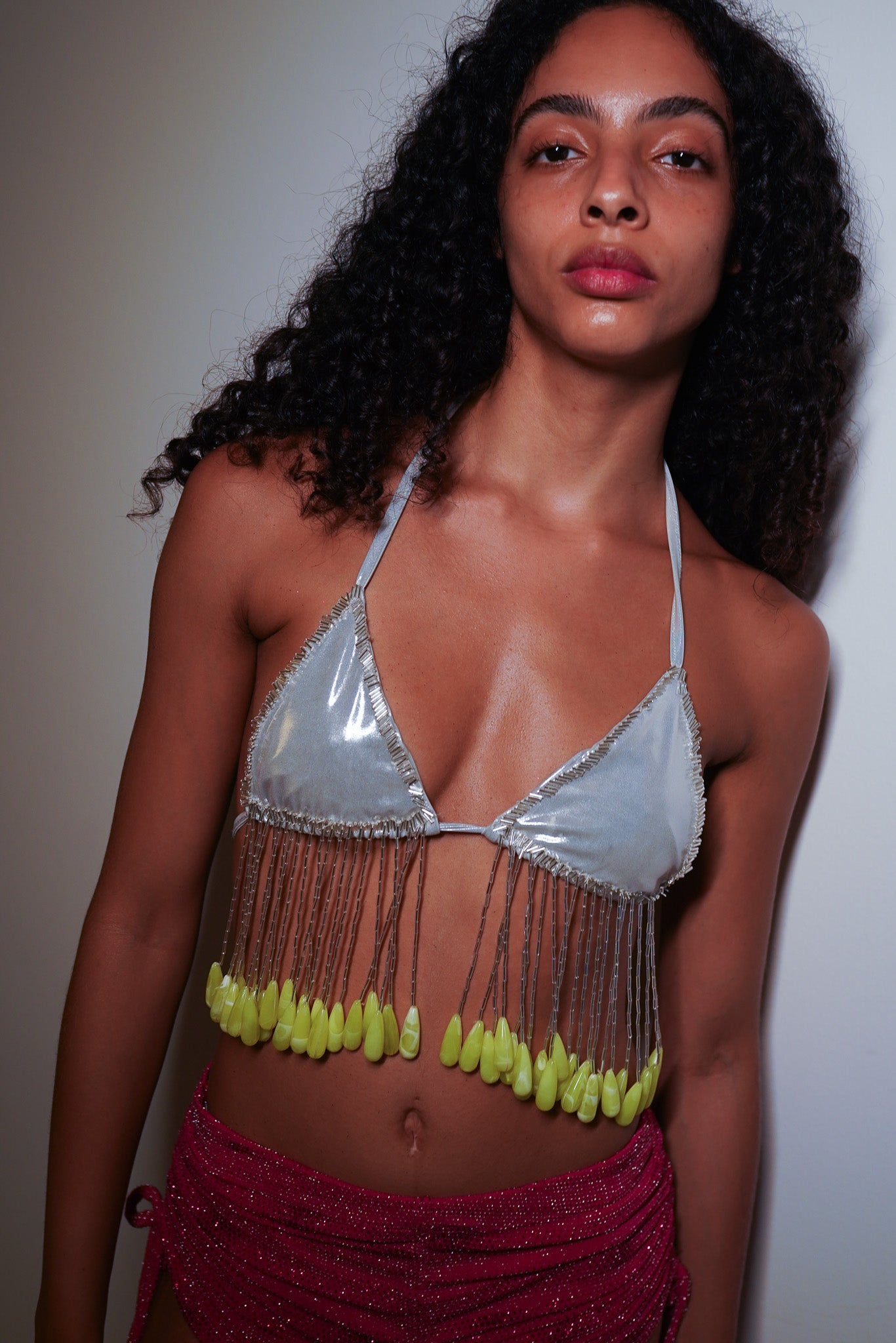 Top de biquíni cortininha duplo de metálica com aplicações de miçangas e canutilhos bordados à mão. A modelo veste P.