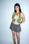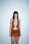 Mini saia confeccionada em paetê, com viés e elástico fino no cós. A modelo veste 36.