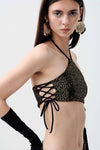 Top faixa de renda metalizada dourada com paetês dourados bordados. Permite diferentes amarrações. A modelo veste P.