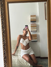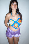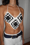 Top em V de crochet feito à mão, de linha de algodão off white e preta, com amarração no pescoço e nas costas. A modelo veste P/M.