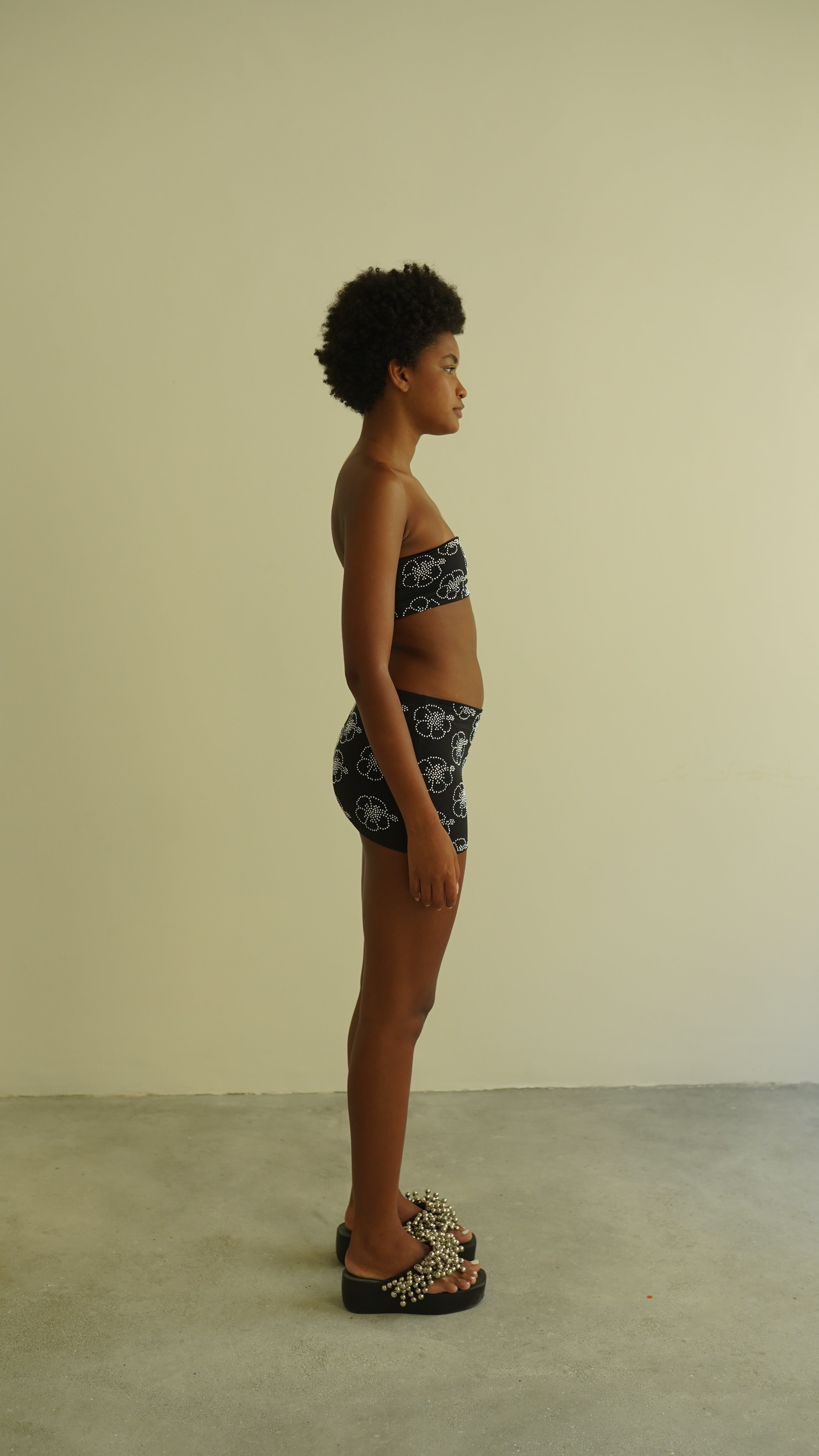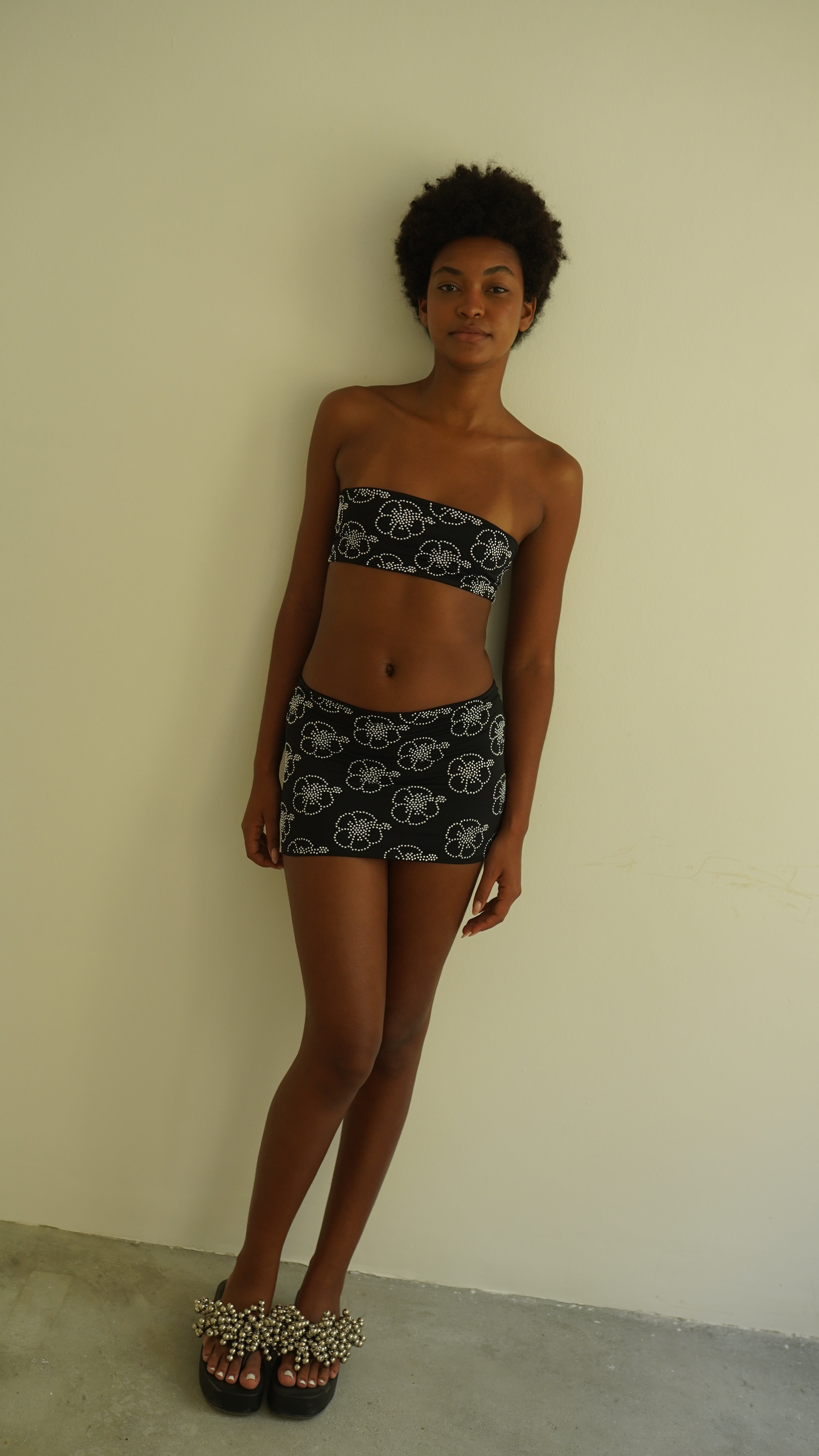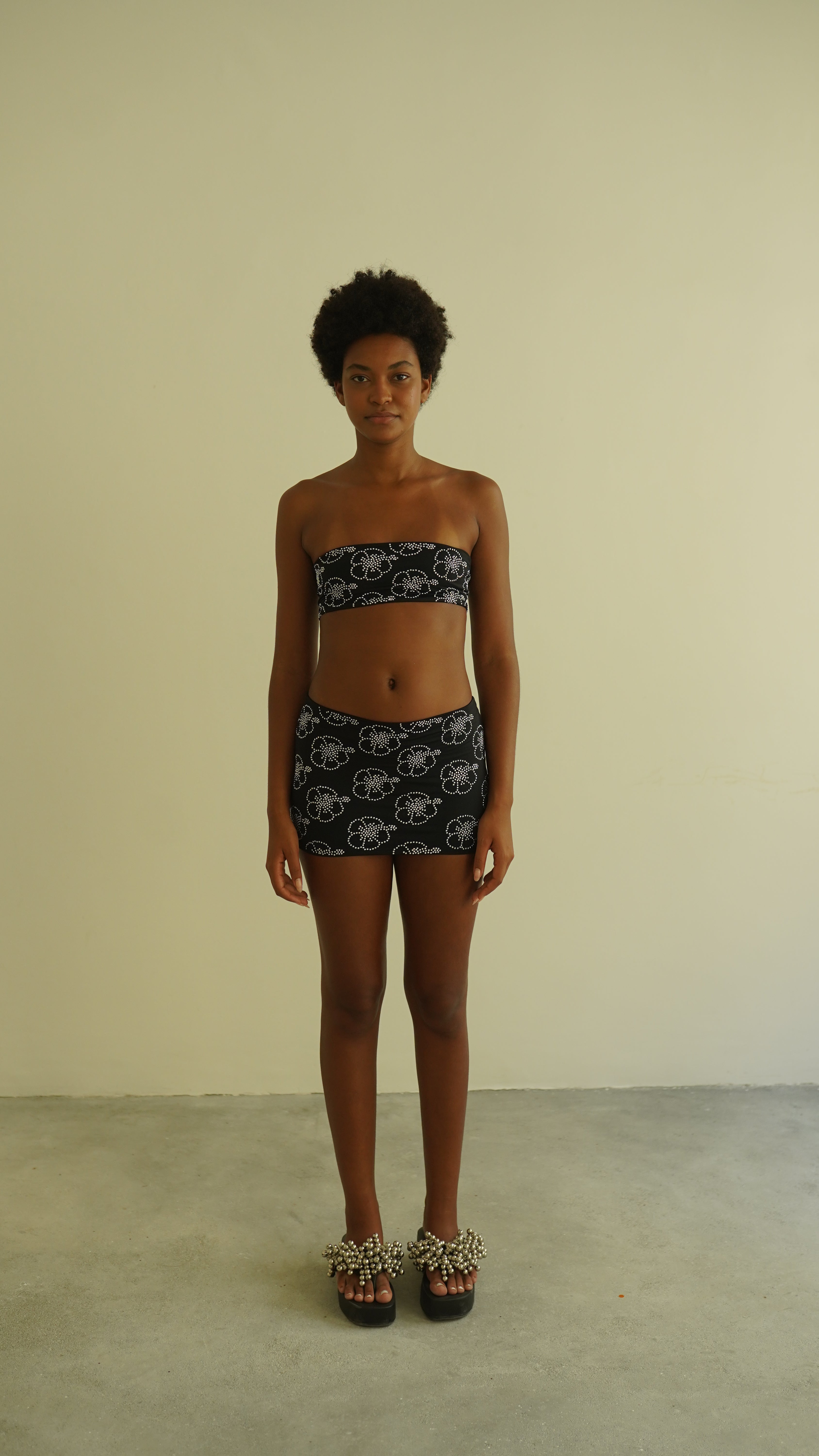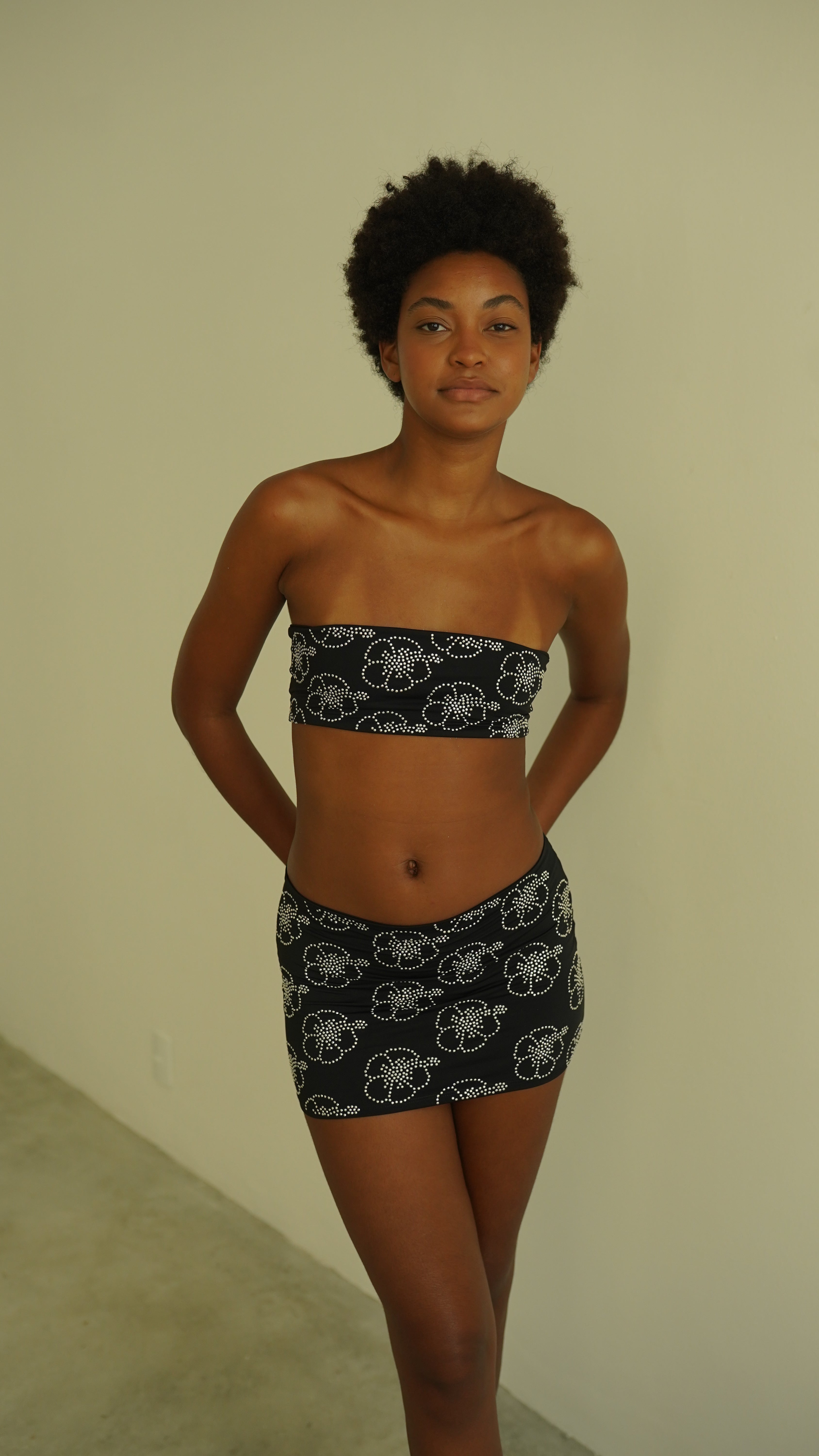 Mini saia dupla de malha macia de toque frio com aplicação de hibiscos de strass. A modelo veste P.
