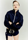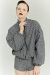 Jaqueta de tecido de algodão com estampa de vichy preto e branco, forrada em cetim. Possui bolsos frontais, elásticos para ajuste na barra e nos punhos e fechamento de zíper frontal. A modelo veste P.