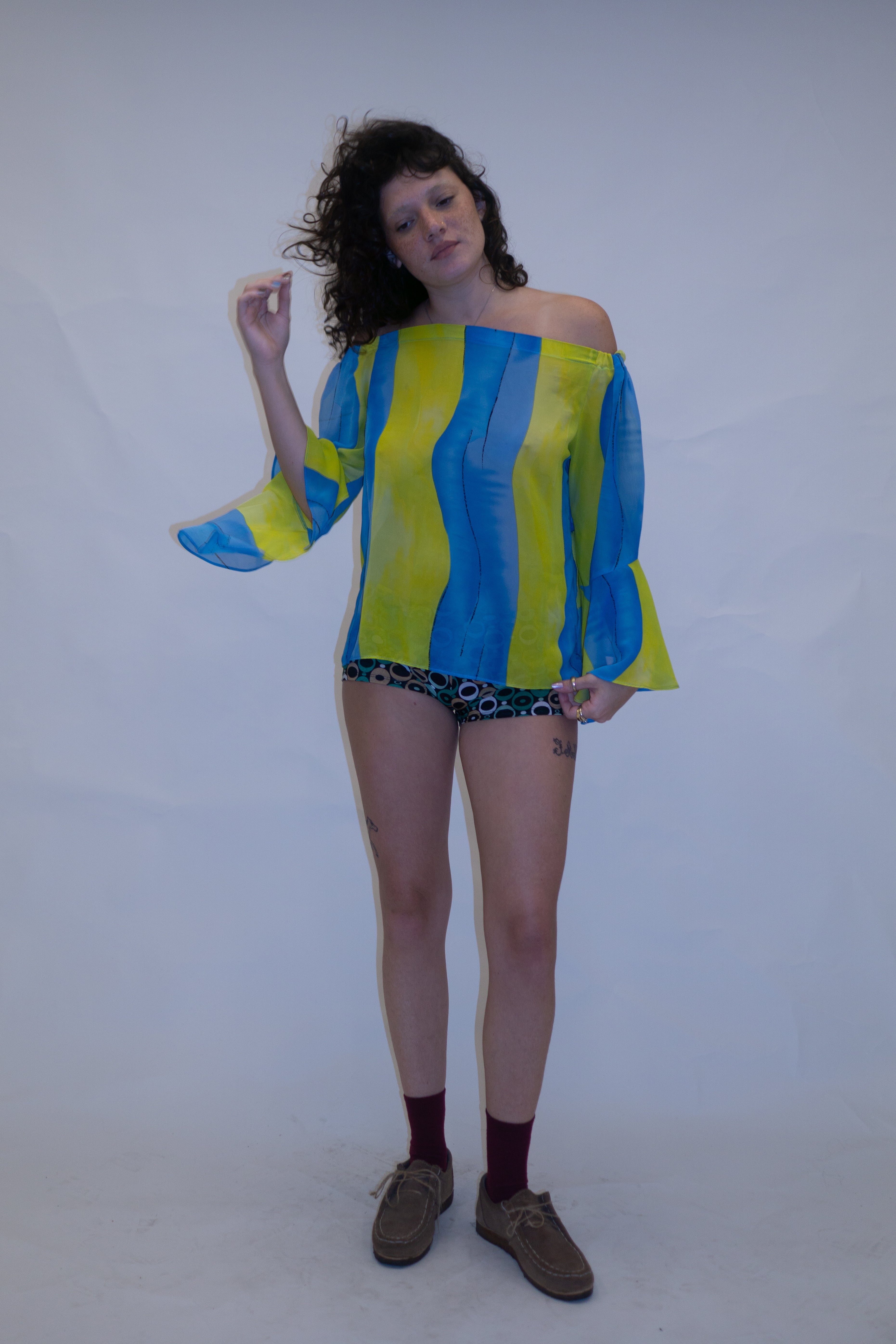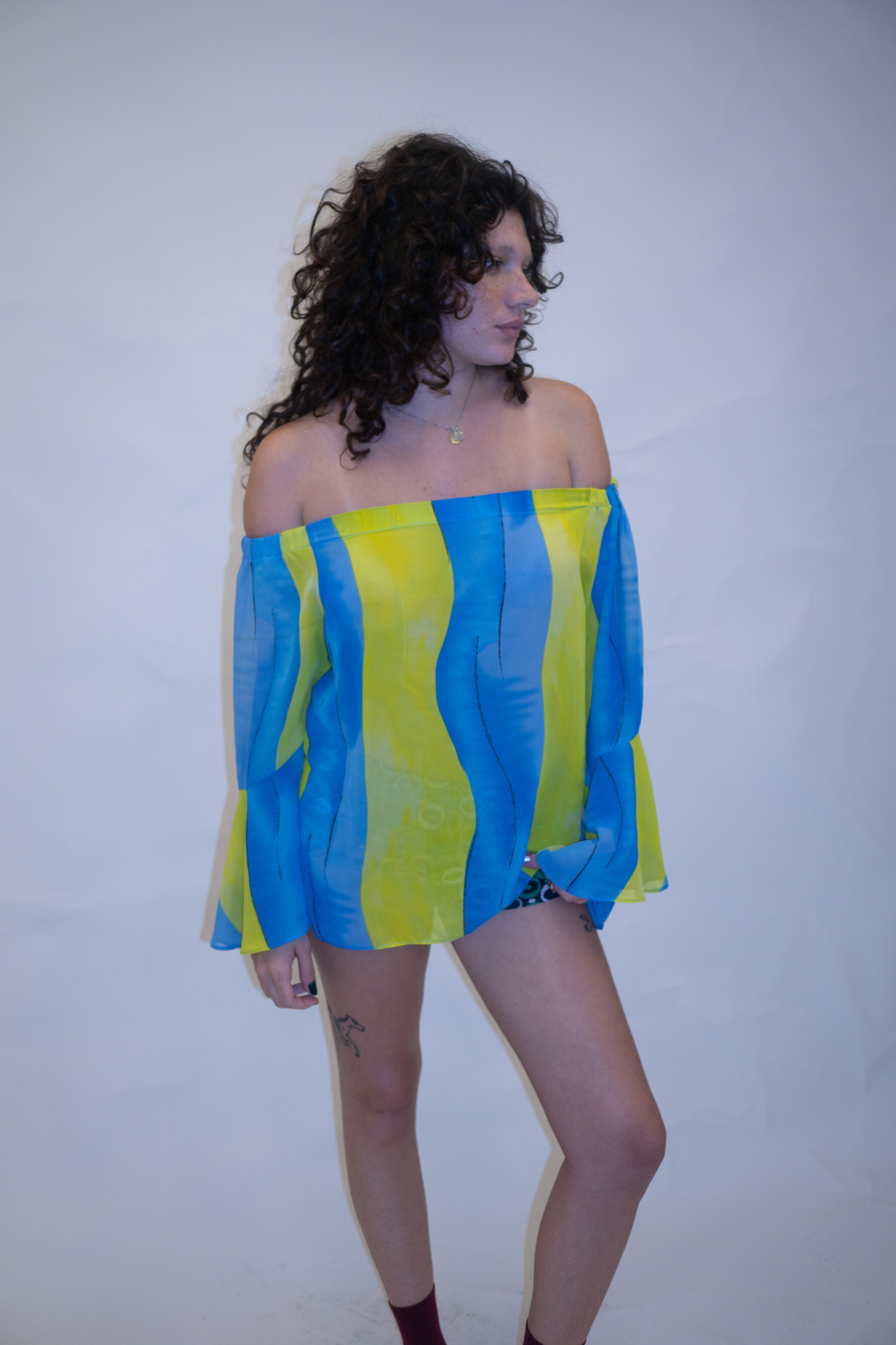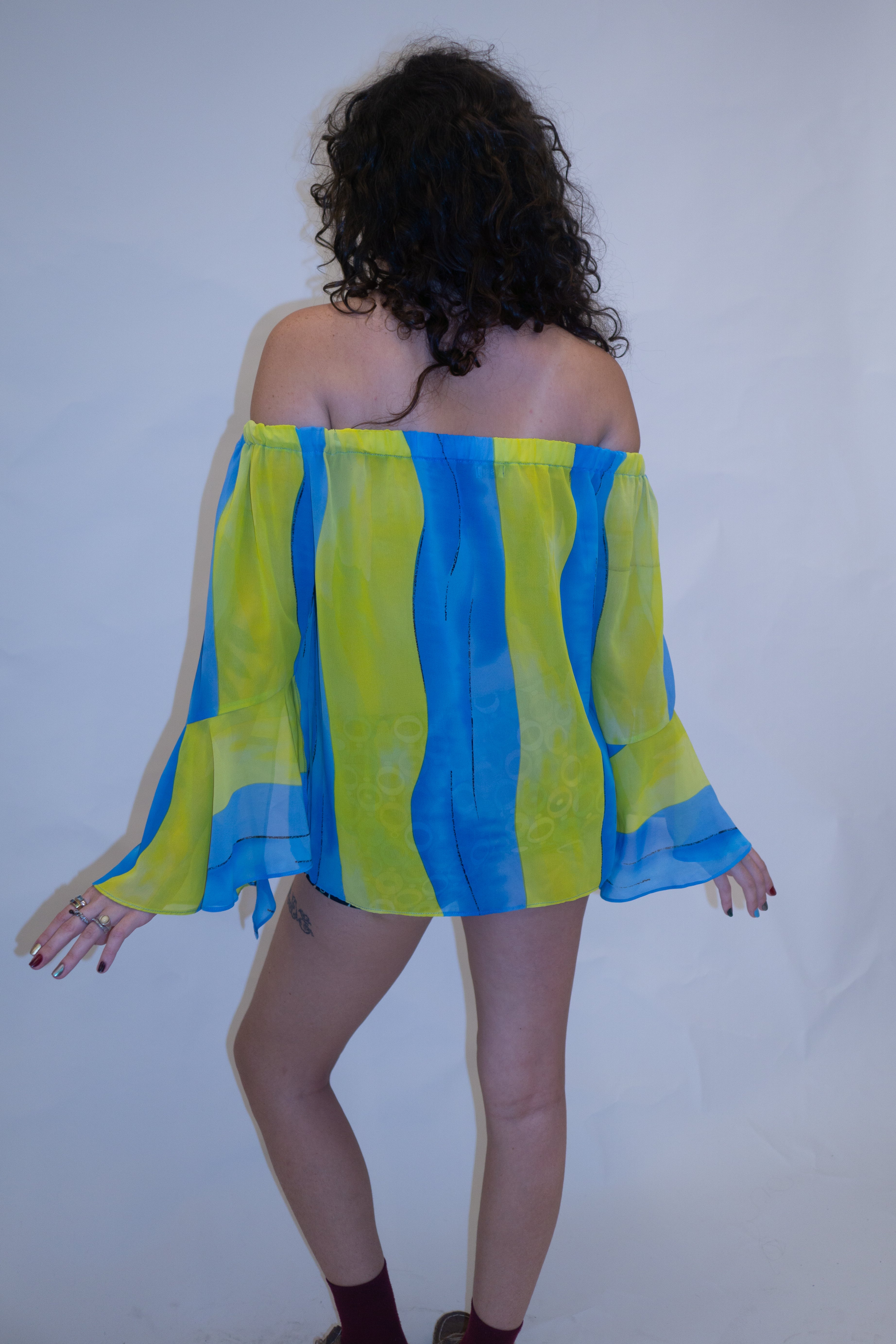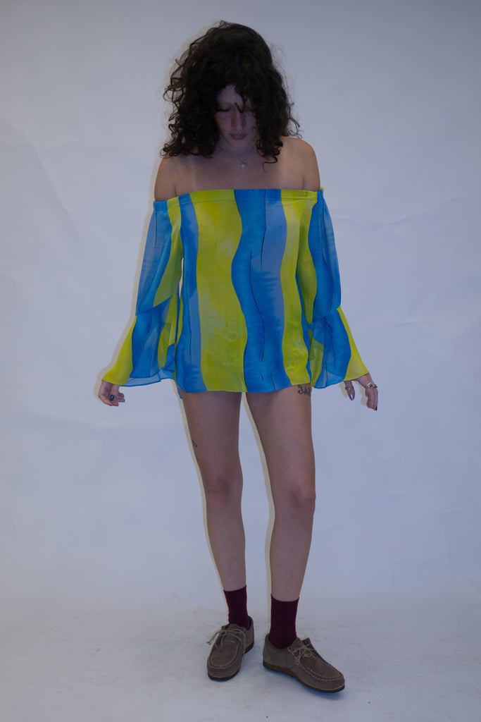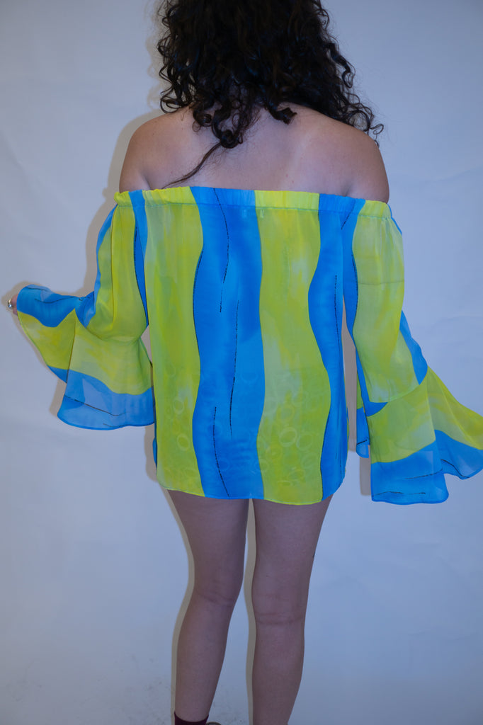Blusa ombro à ombro em chiffon azul e amarelo. Levemente transparente, possui elástico no ombro e manga flare com abertura.