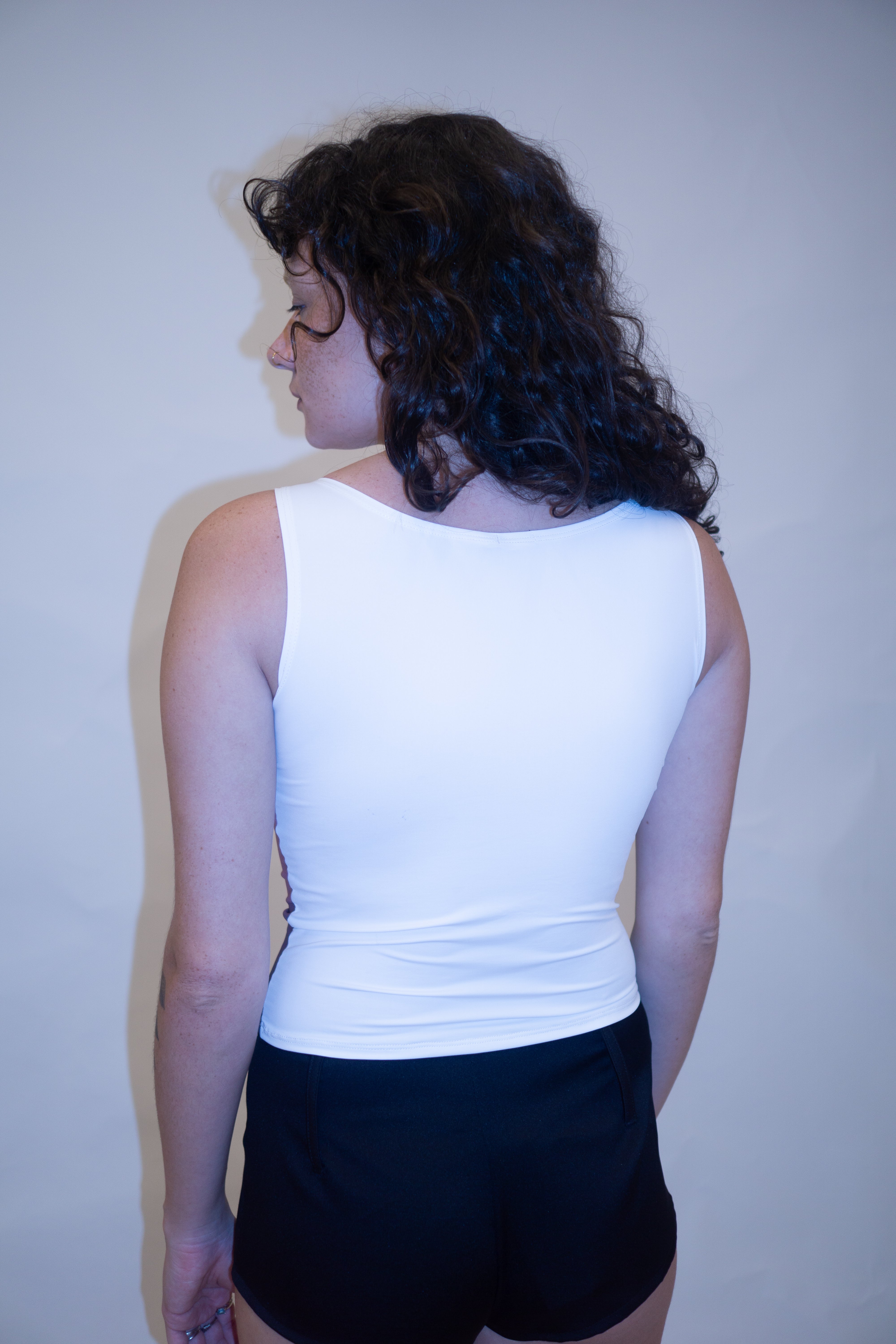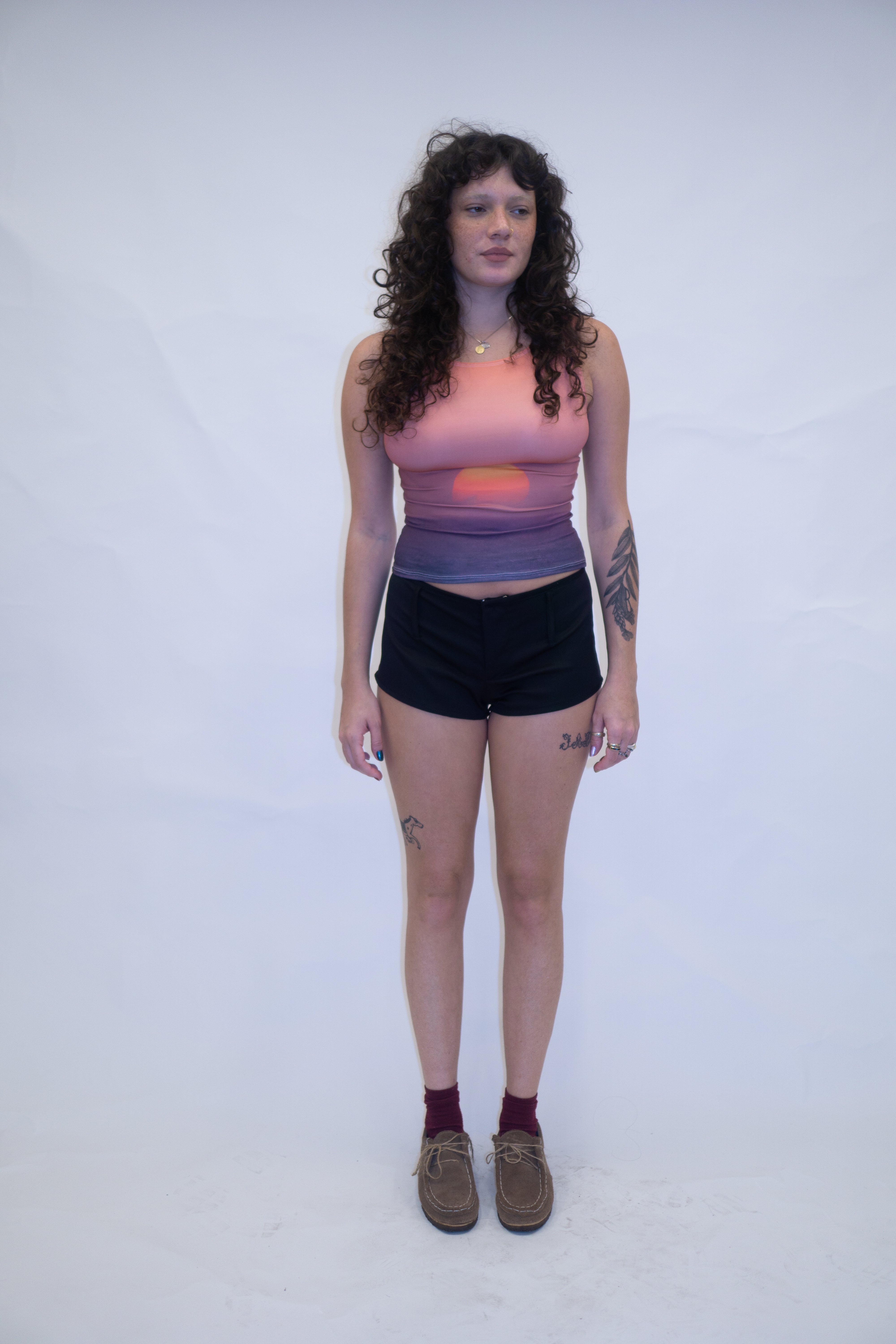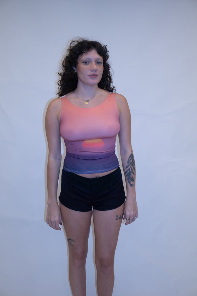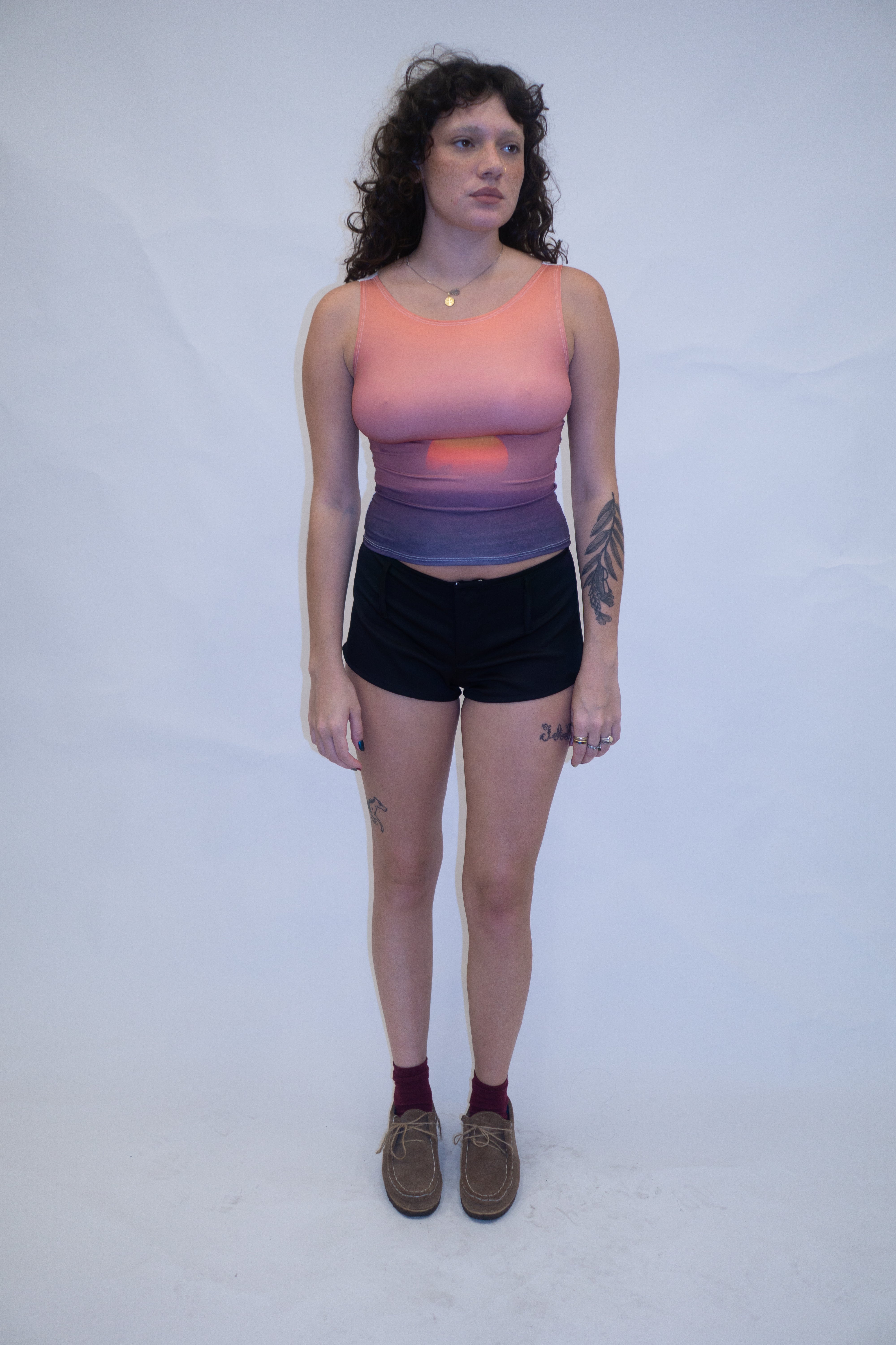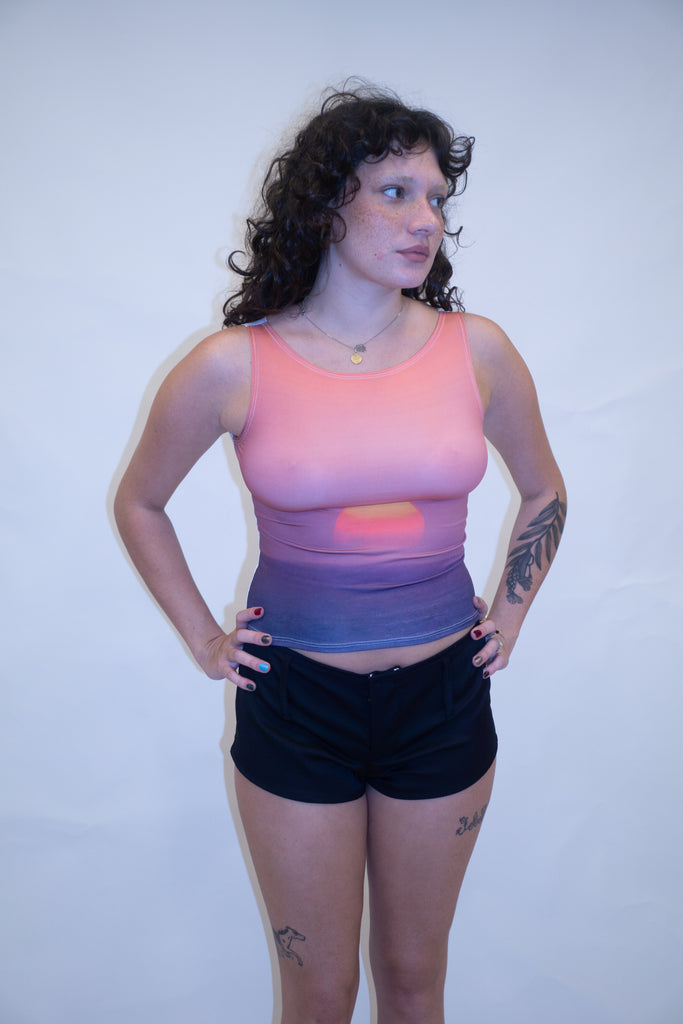 Top de malha fria, com decote canoa, estampa de pôr do sol e costas brancas.