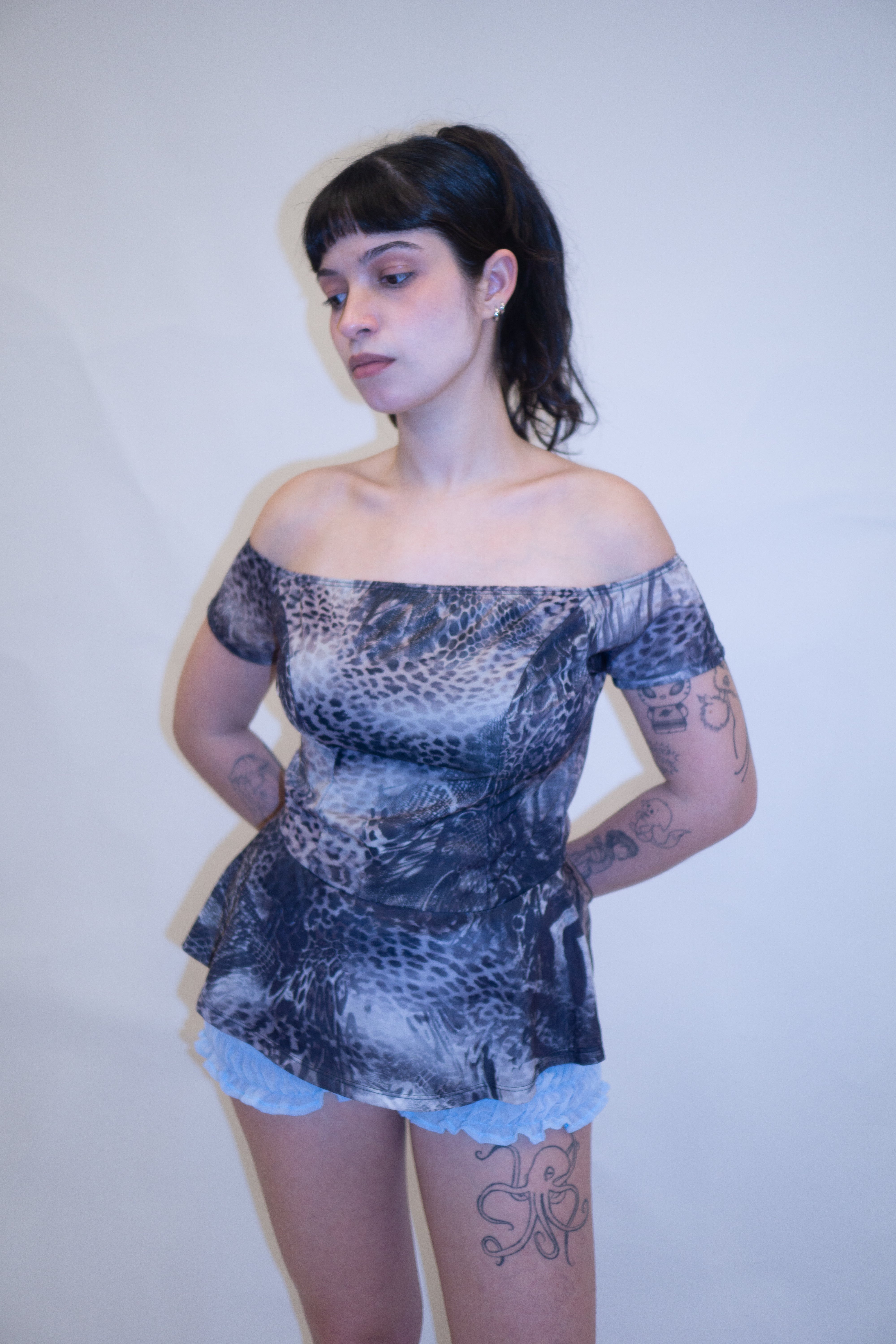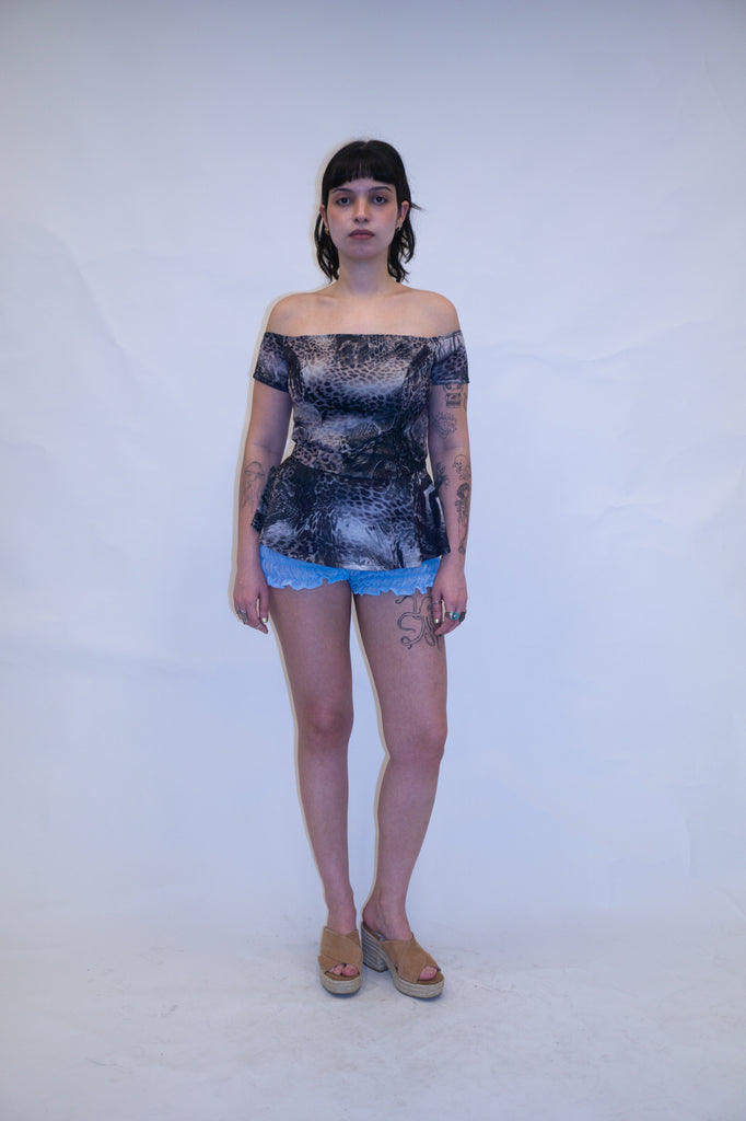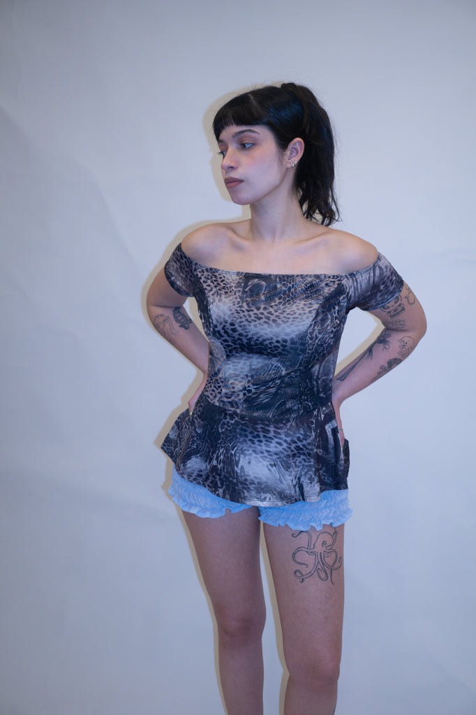 Top animal print com mangas ombro a ombro, caidinhas. Modelo peplum. Estica um pouco