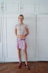 Camiseta justa de renda com manga curta, gola. A modelo veste PP.