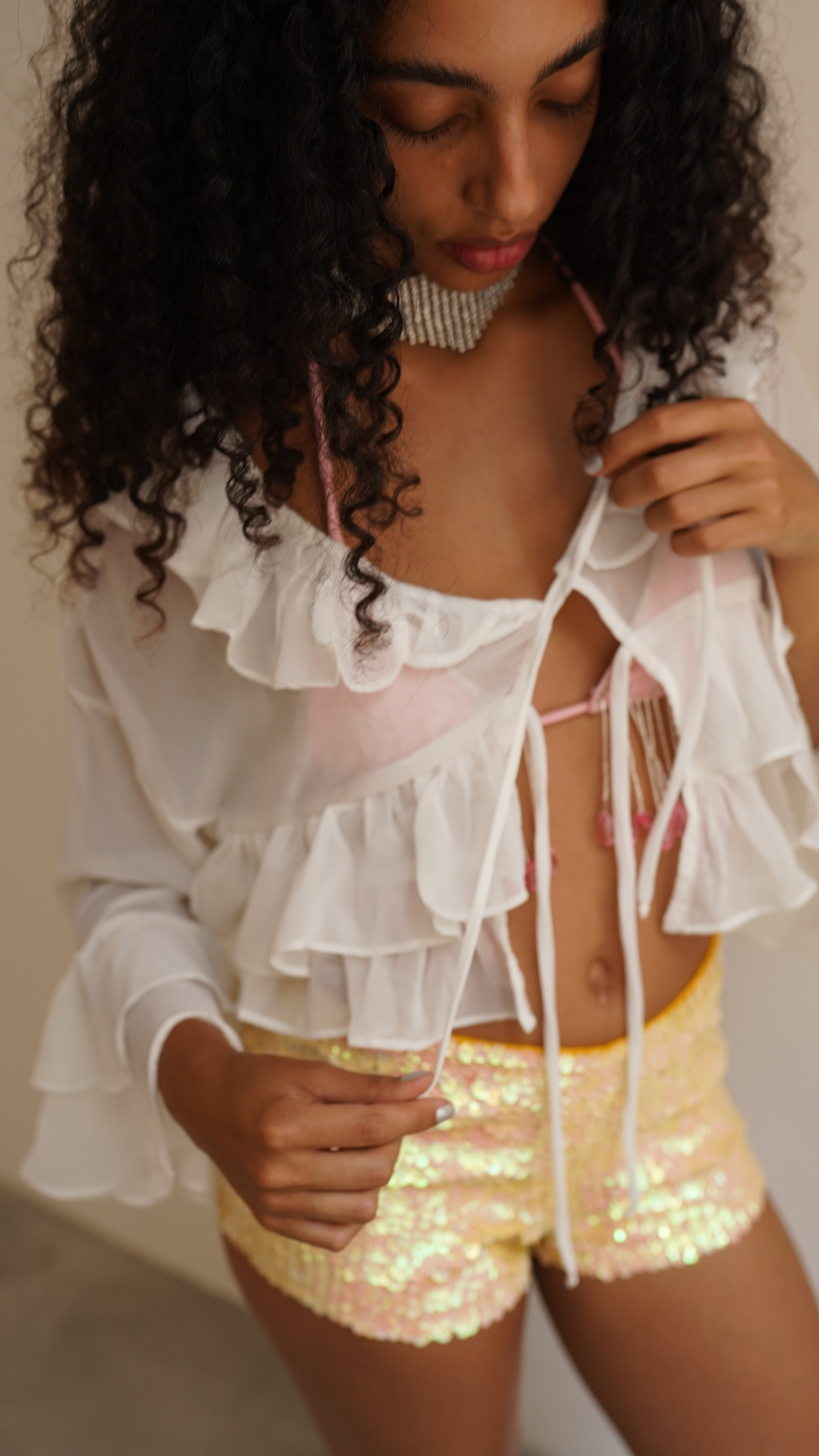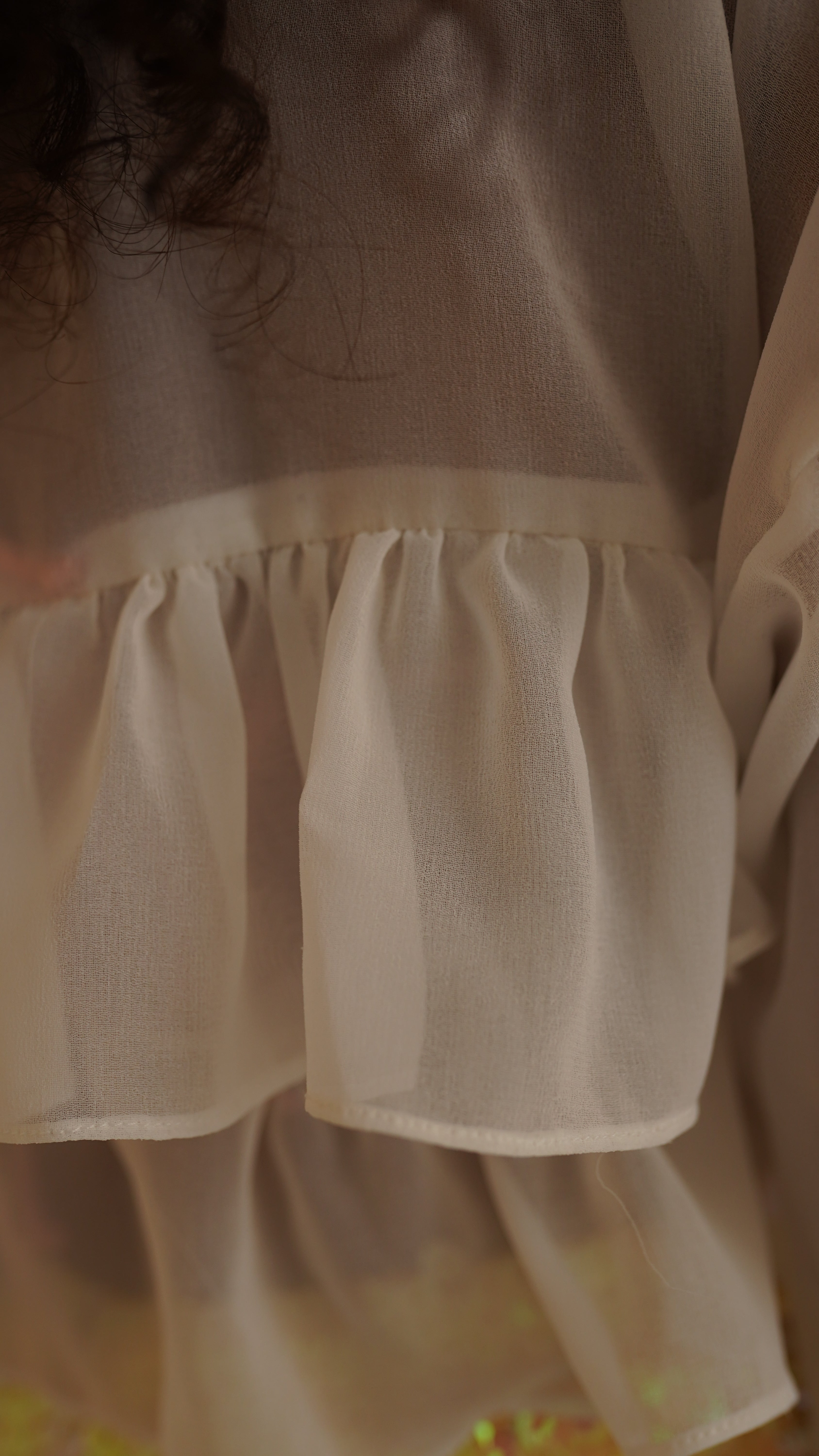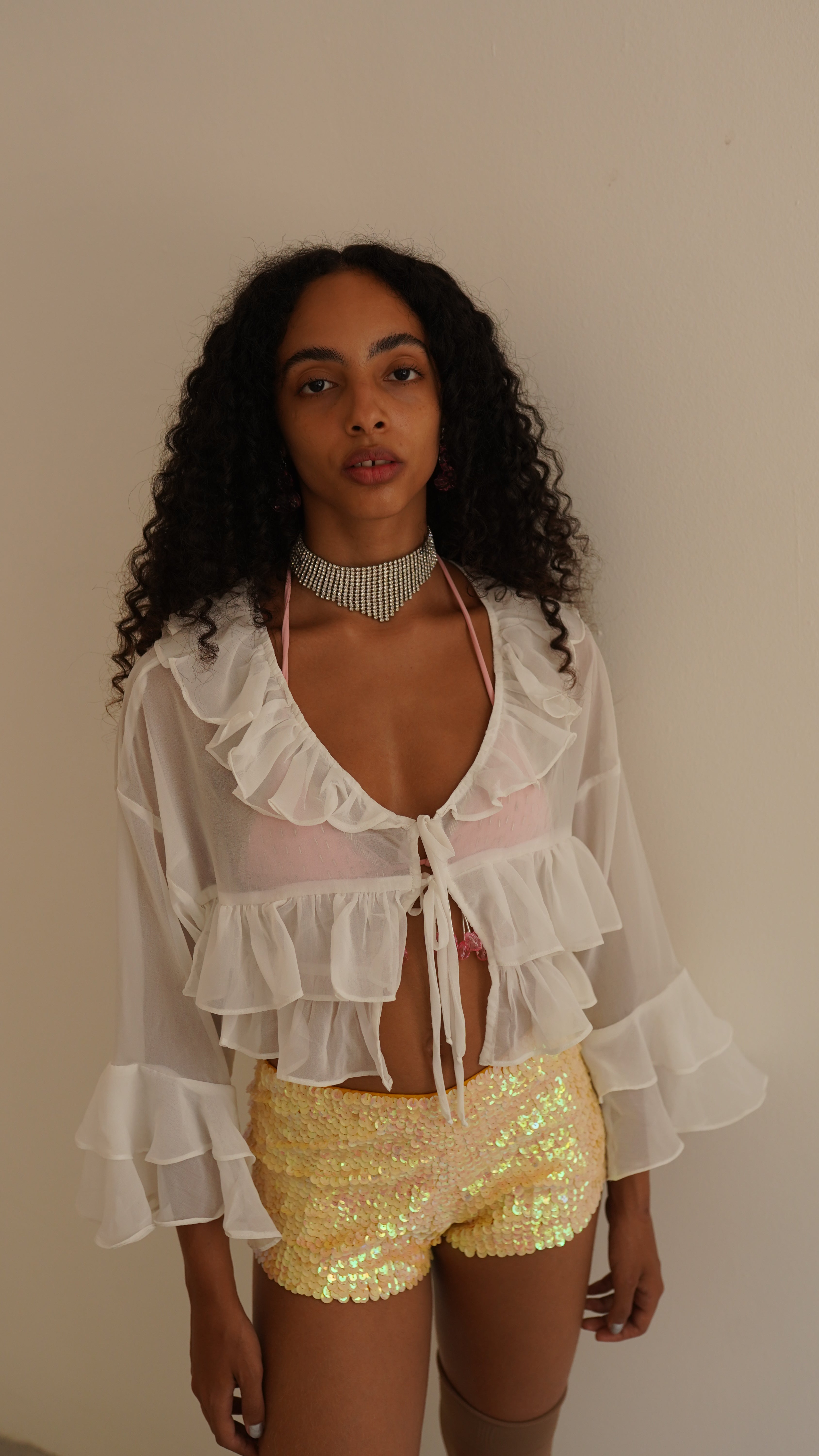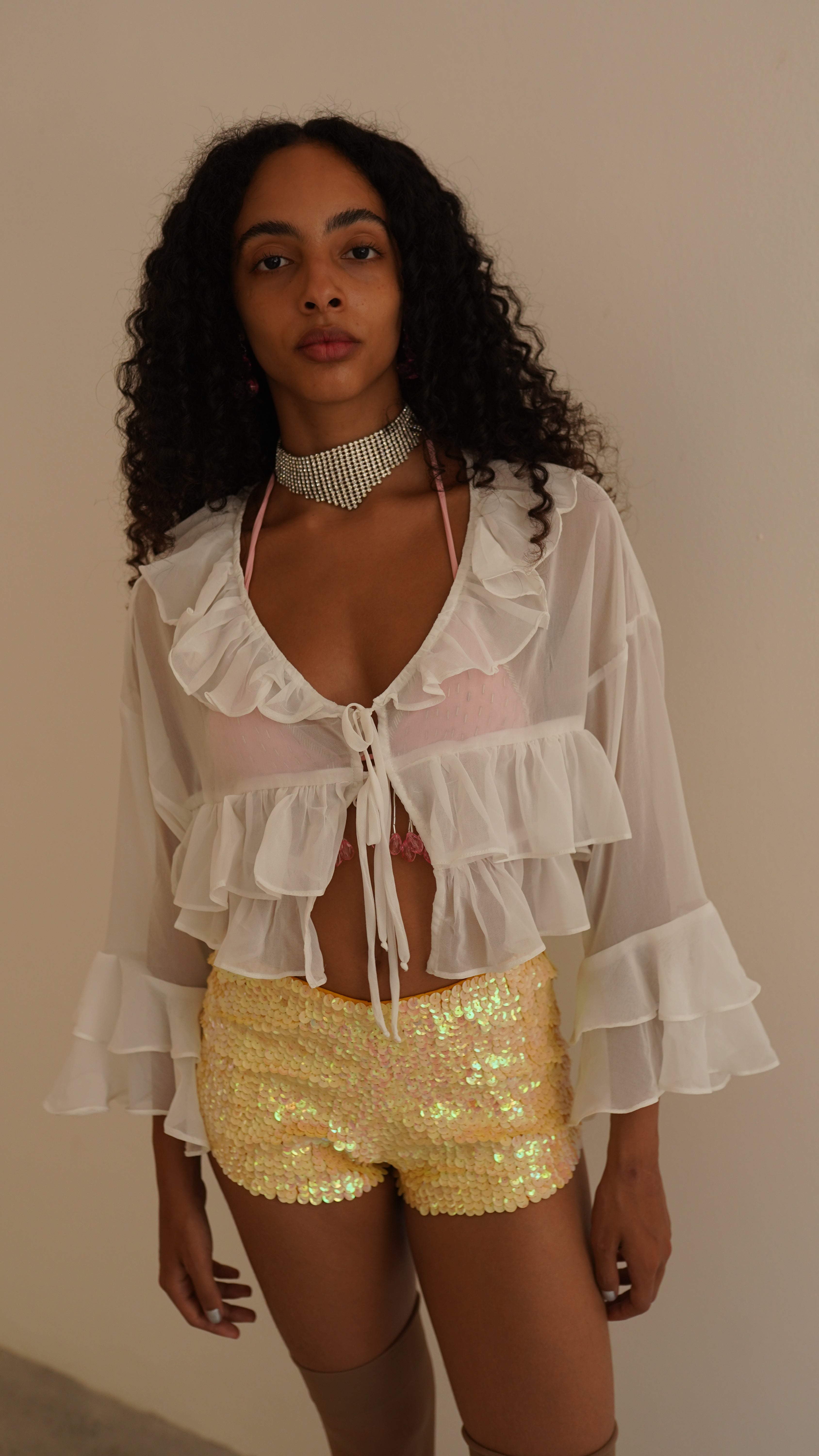 Blusa de manga longa em chiffon branco. Possui babados e dois rolotês para amarração. Tecido super leve e delicado. A modelo veste P.