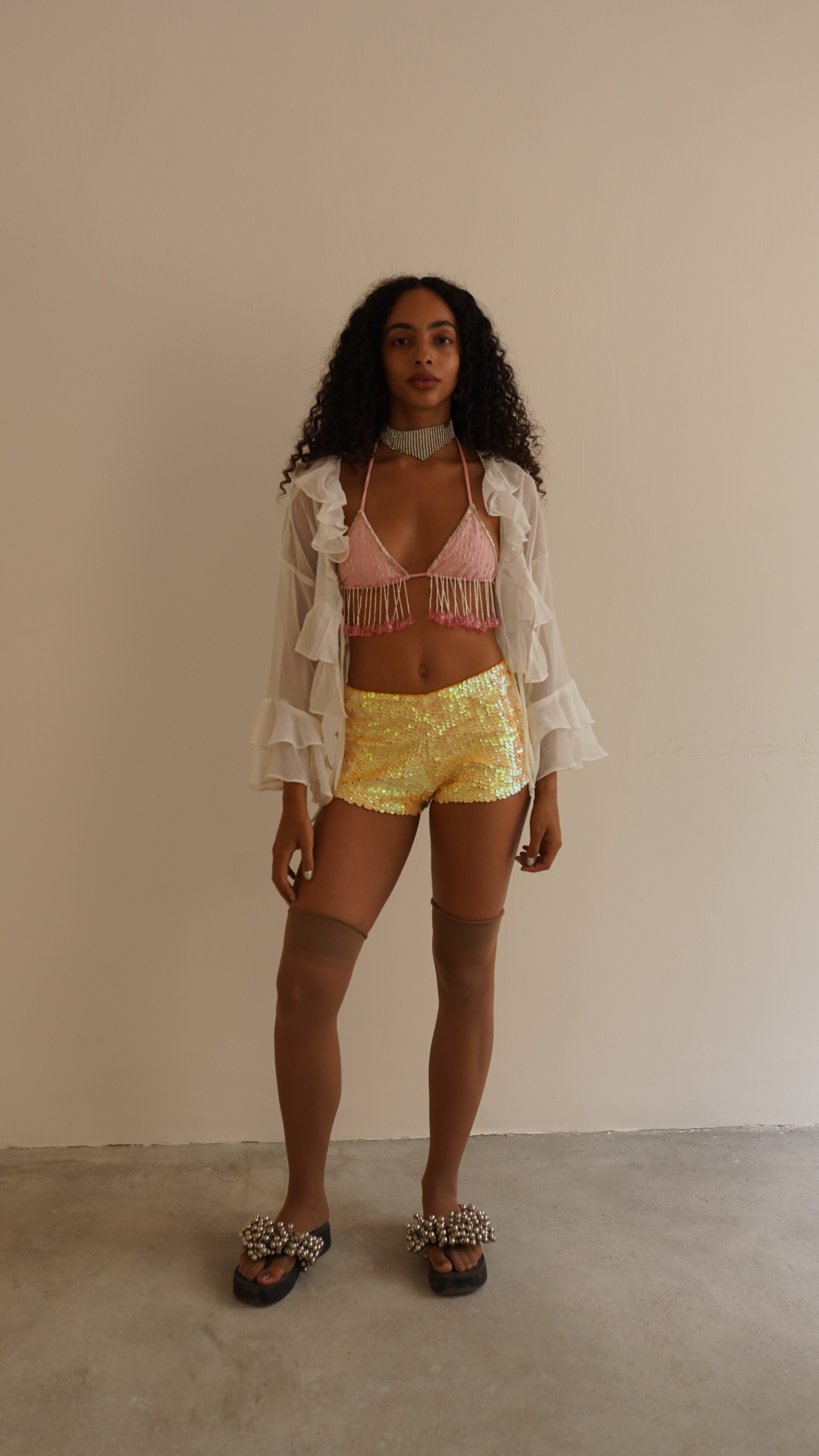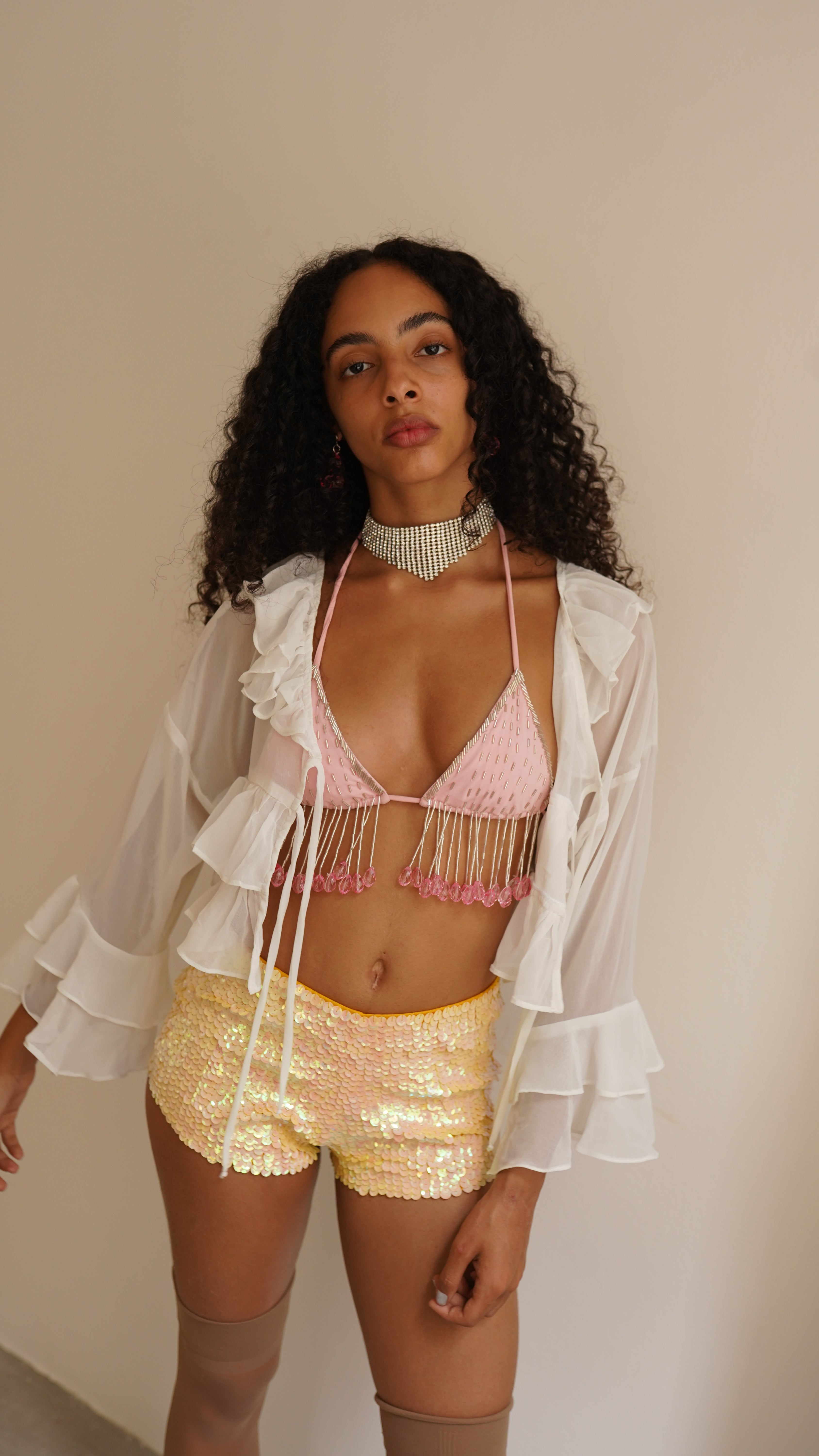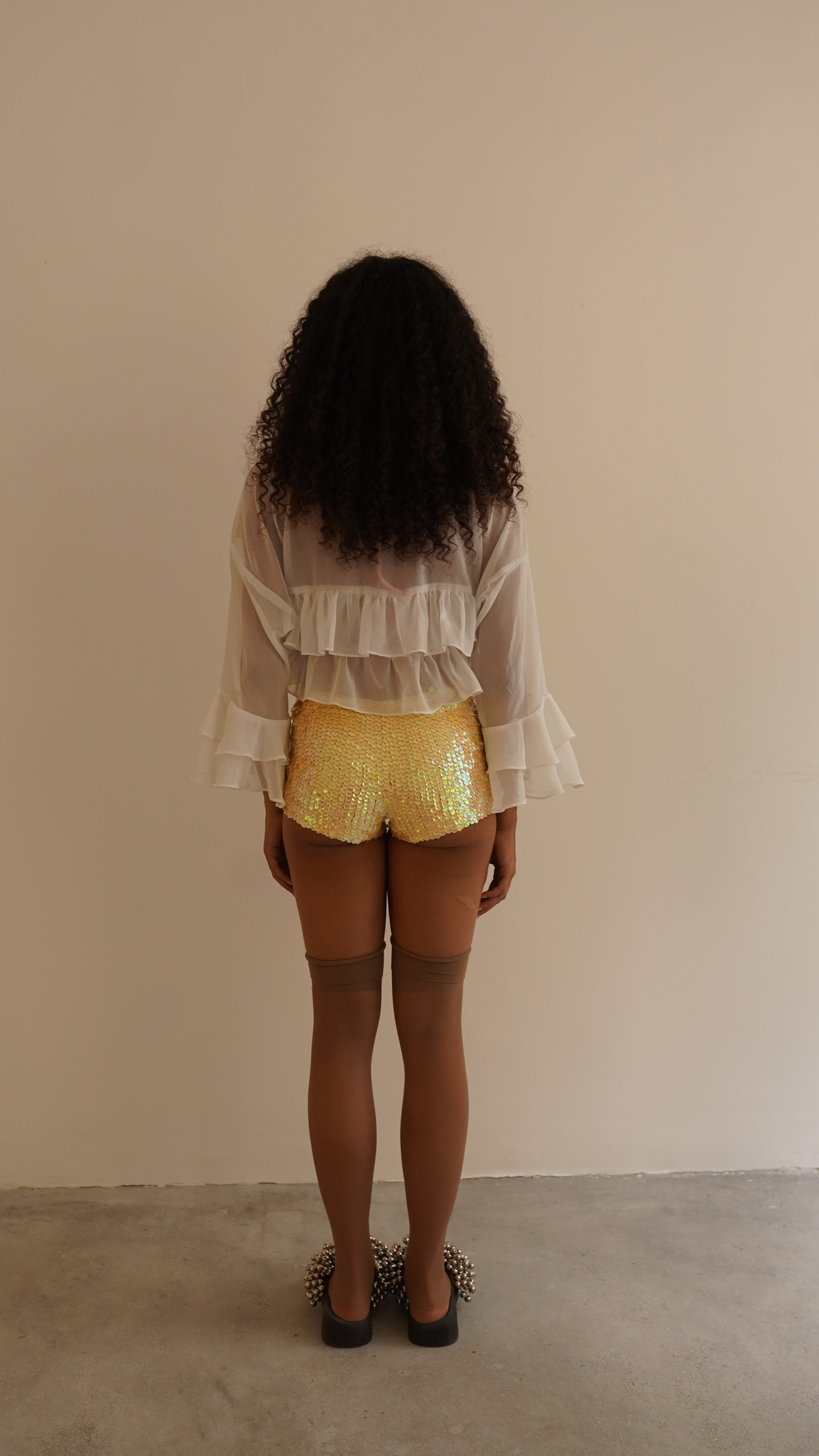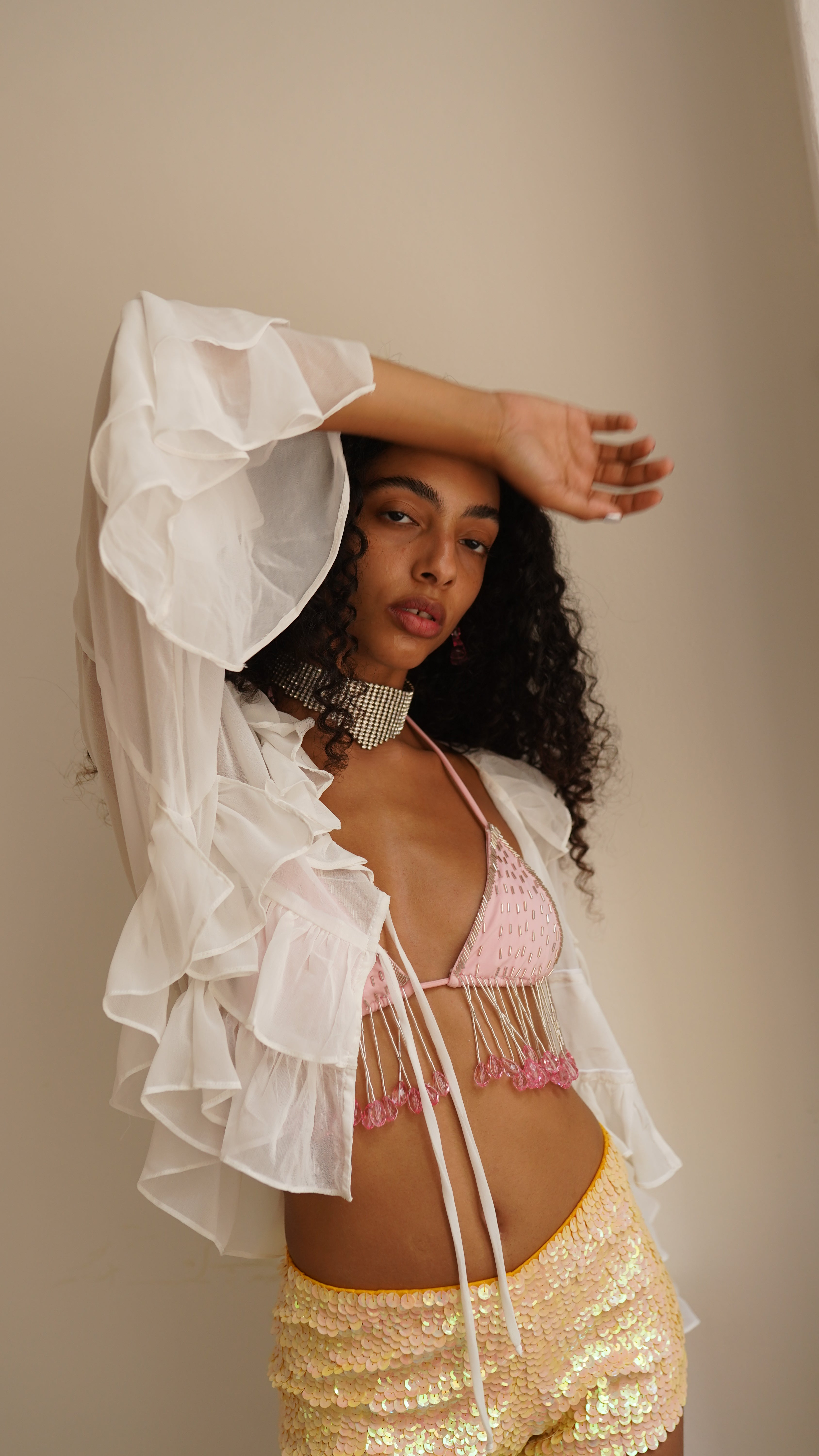 Blusa de manga longa em chiffon branco. Possui babados e dois rolotês para amarração. Tecido super leve e delicado. A modelo veste P.