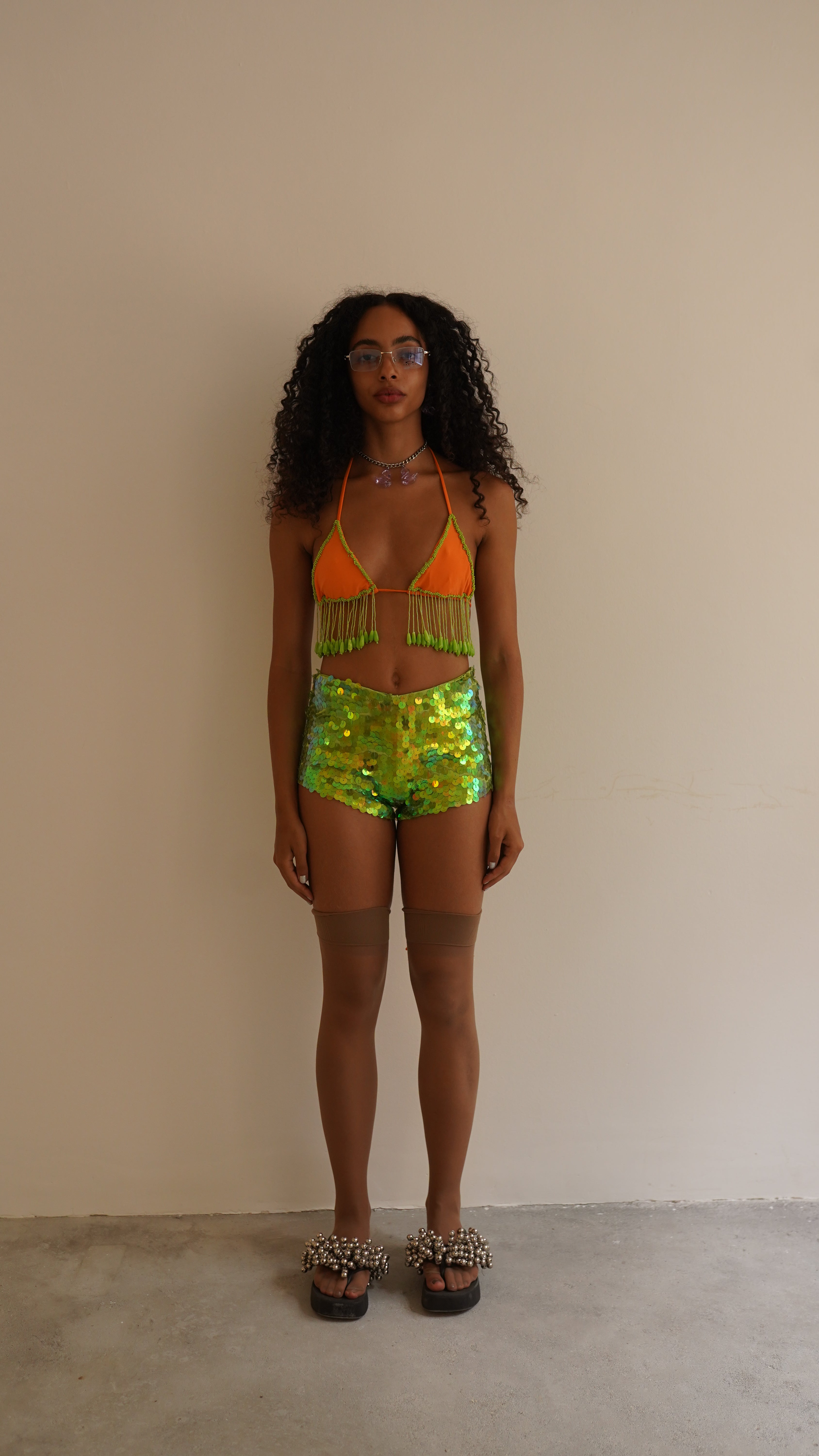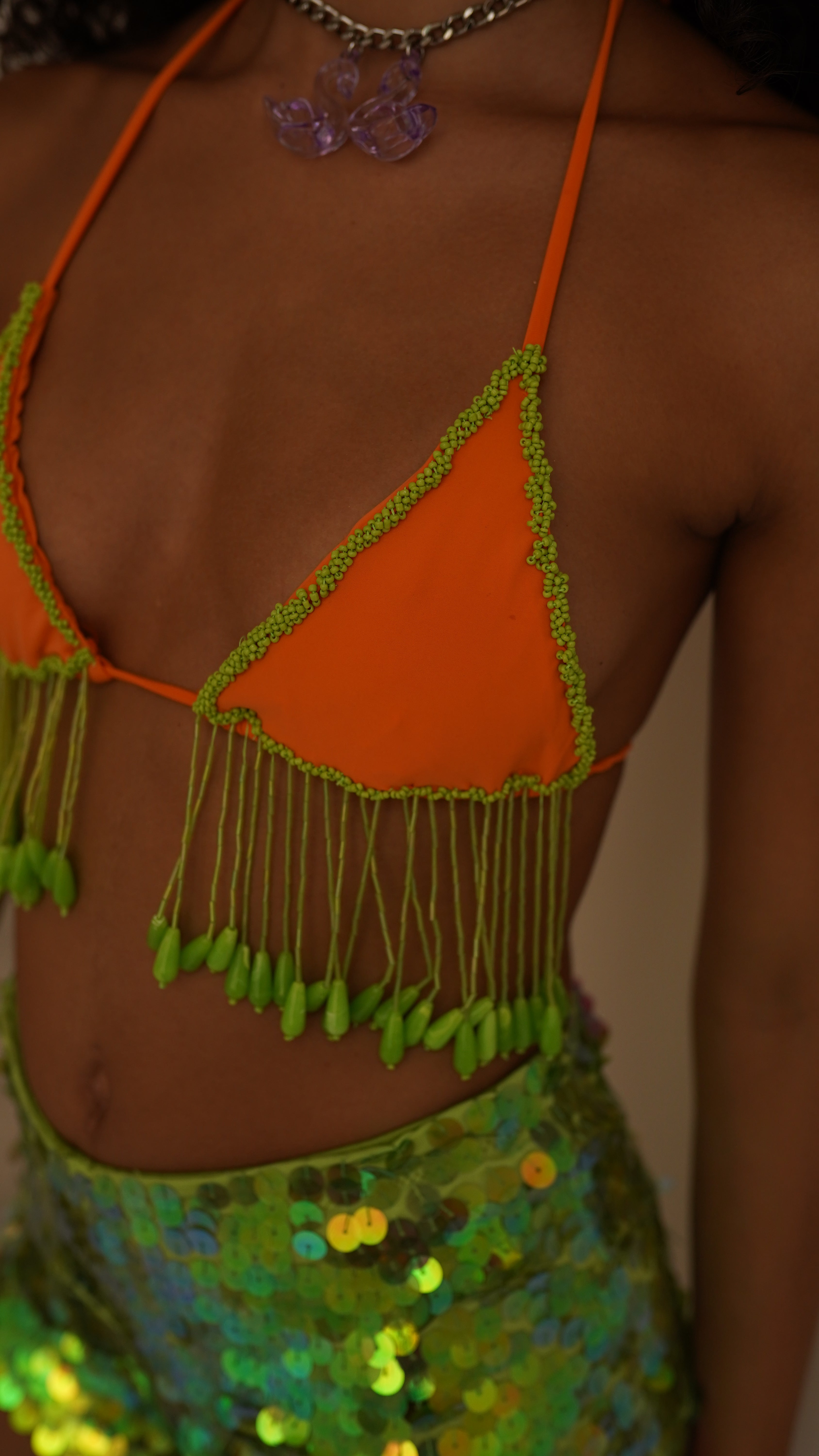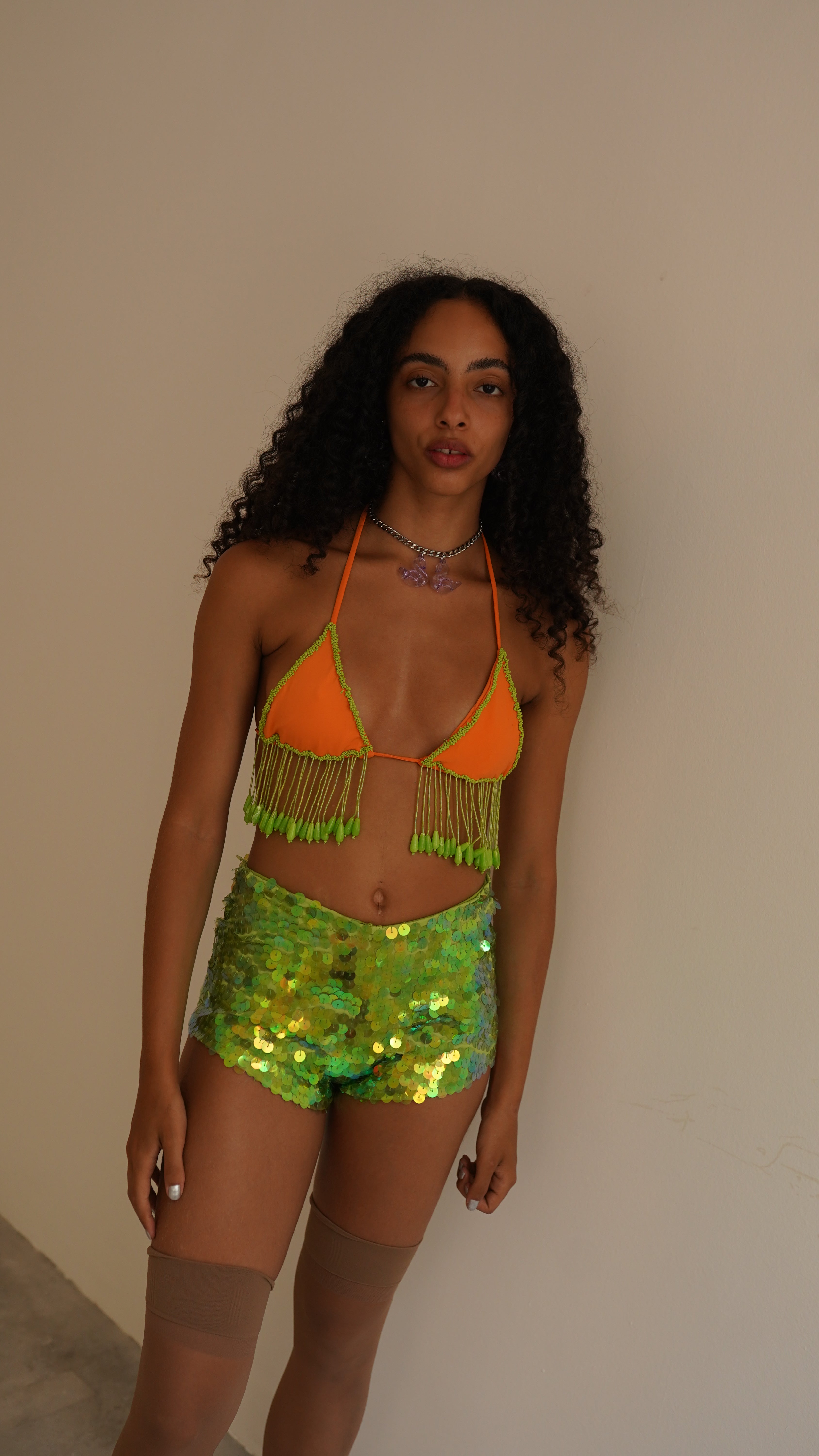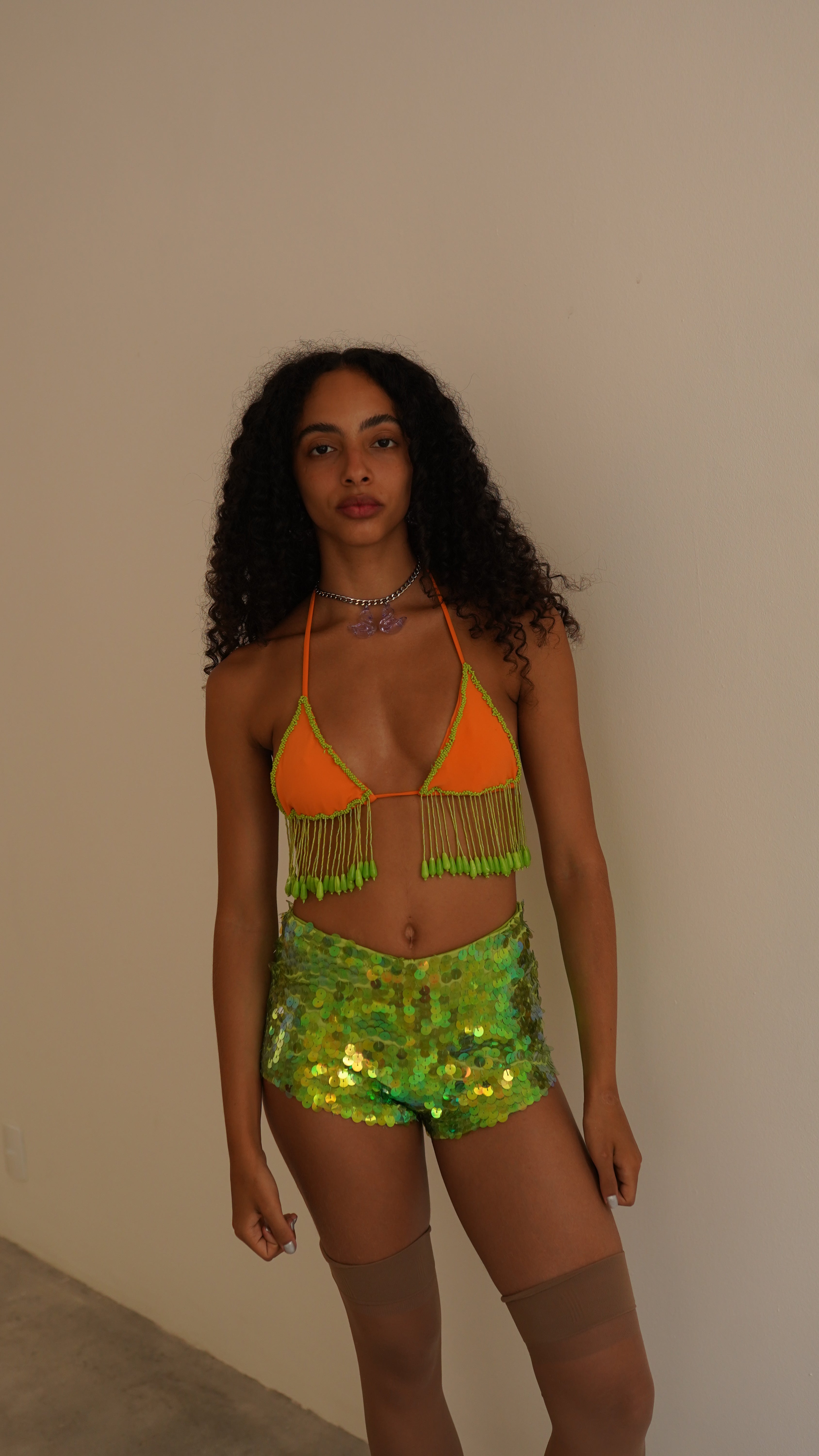 Top de biquíni cortininha duplo de malha macia com toque frio com aplicações de miçangas e canutilhos bordados à mão. A modelo veste P.
