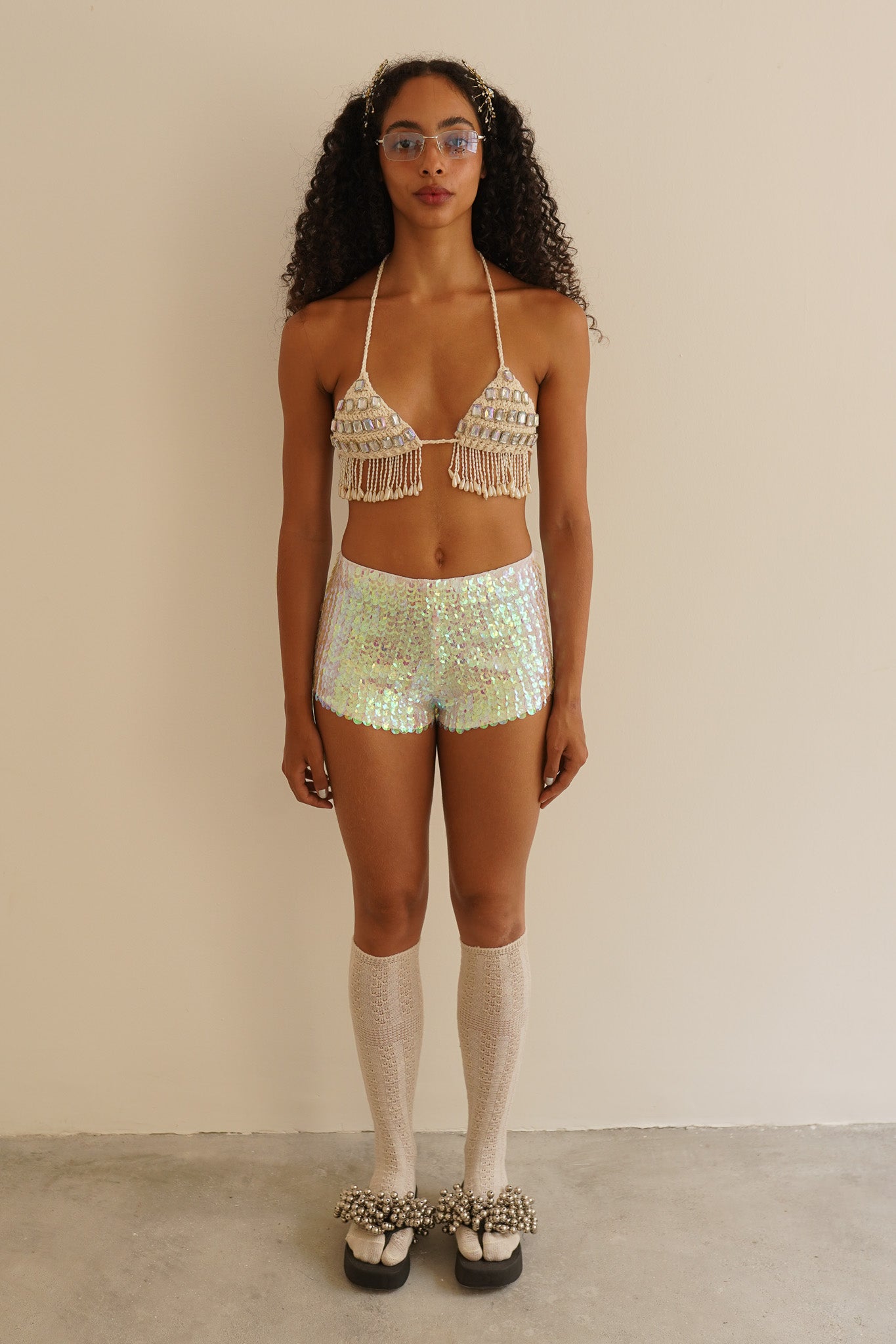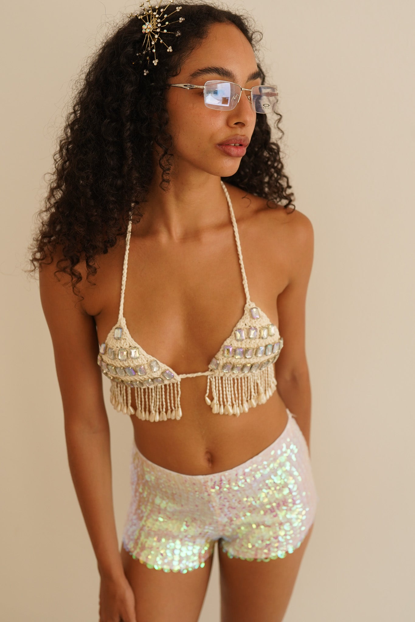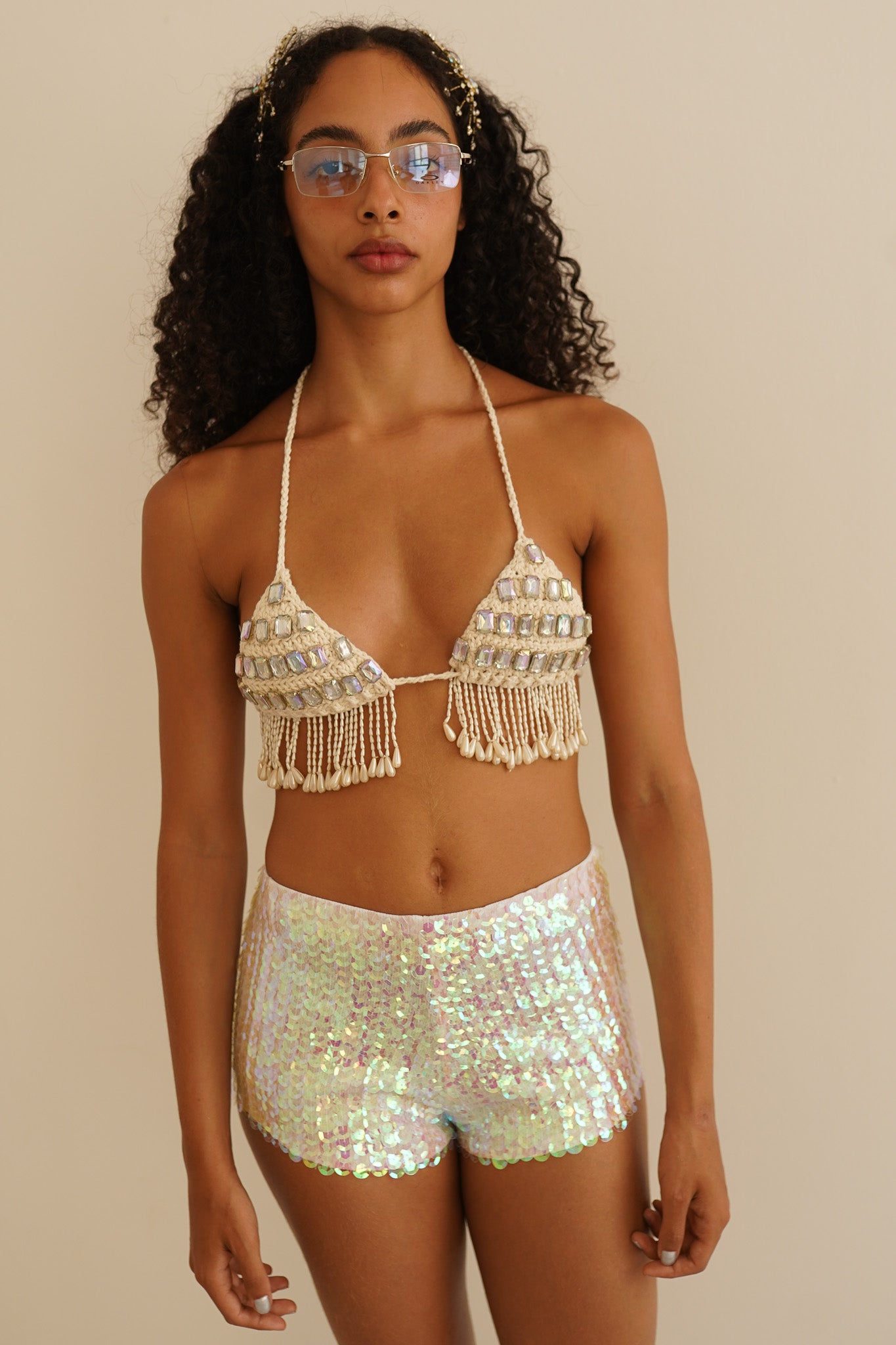 Top triangular de crochet, com pedrarias bordadas e franjas de pérolas, todo feito e bordado à mão. A modelo veste P.