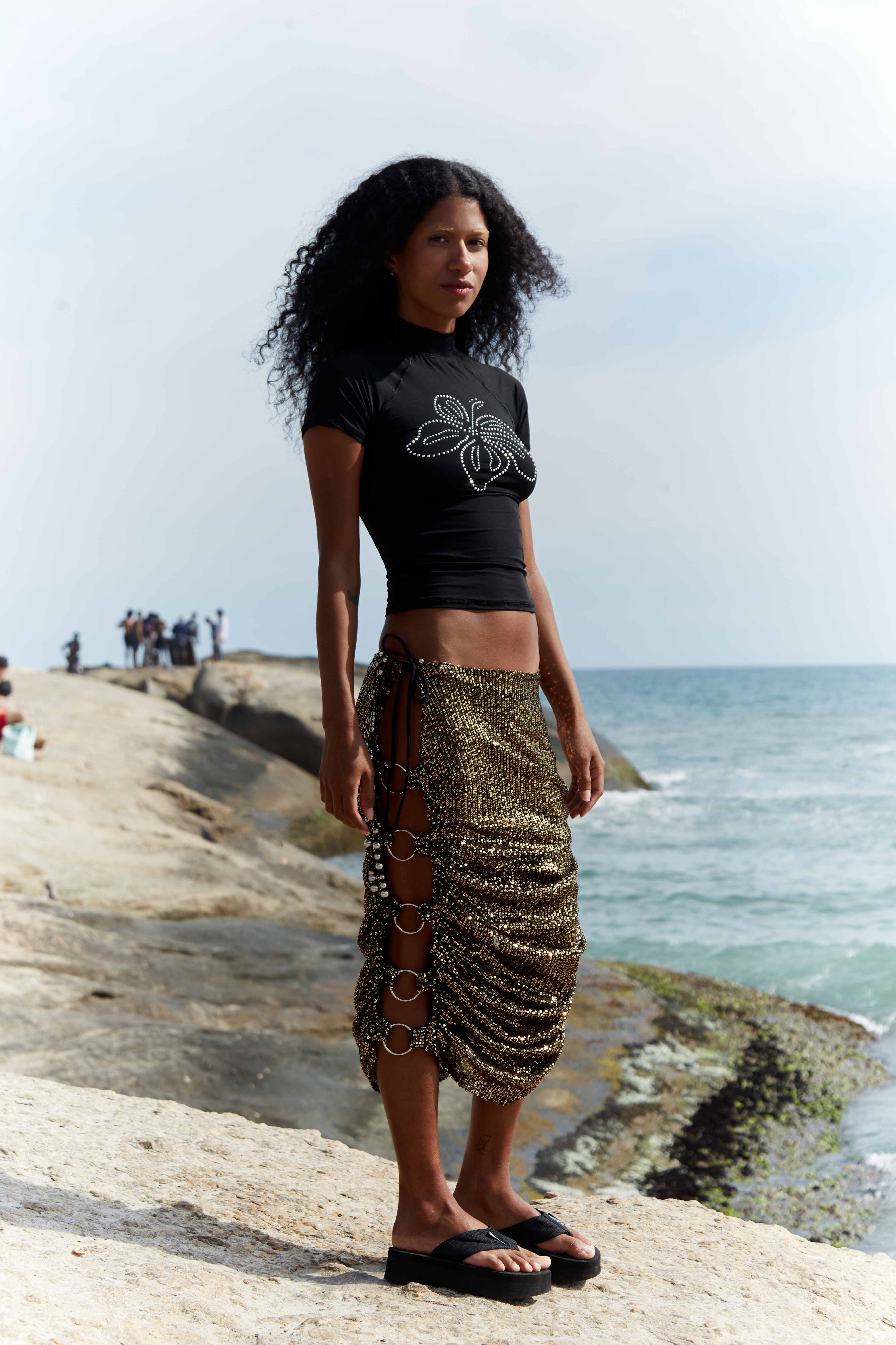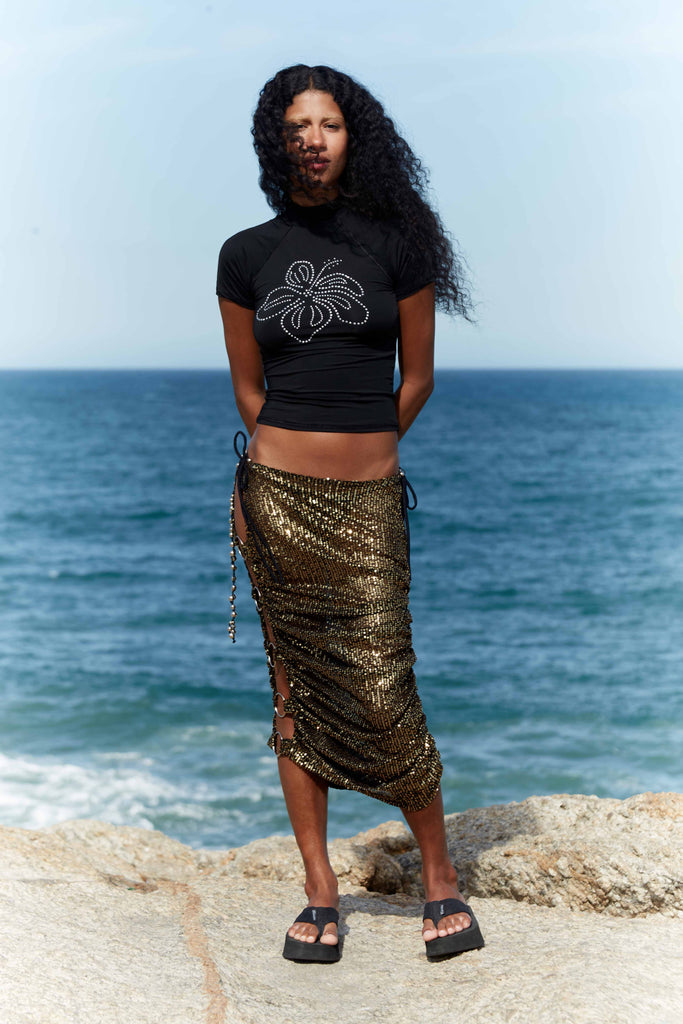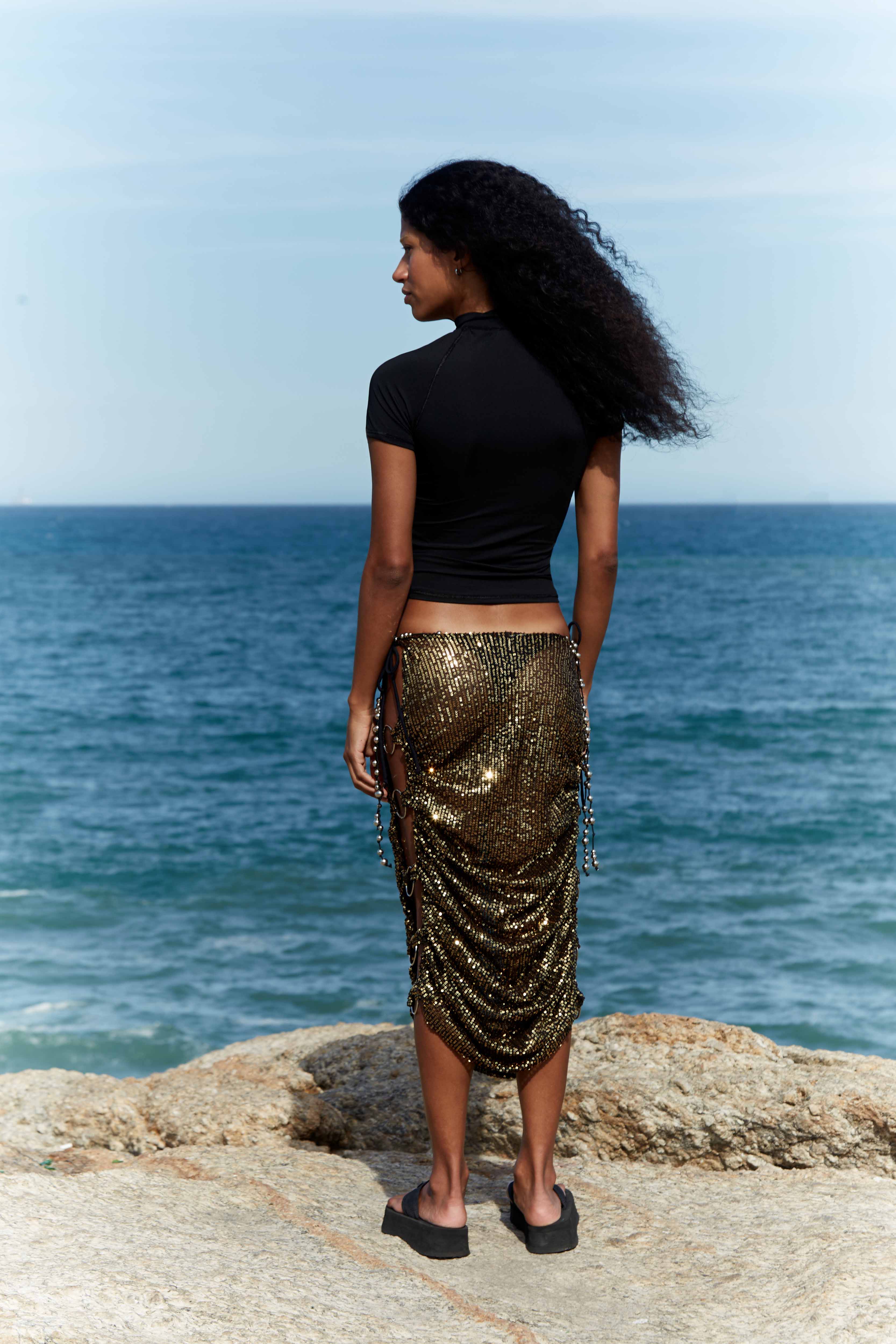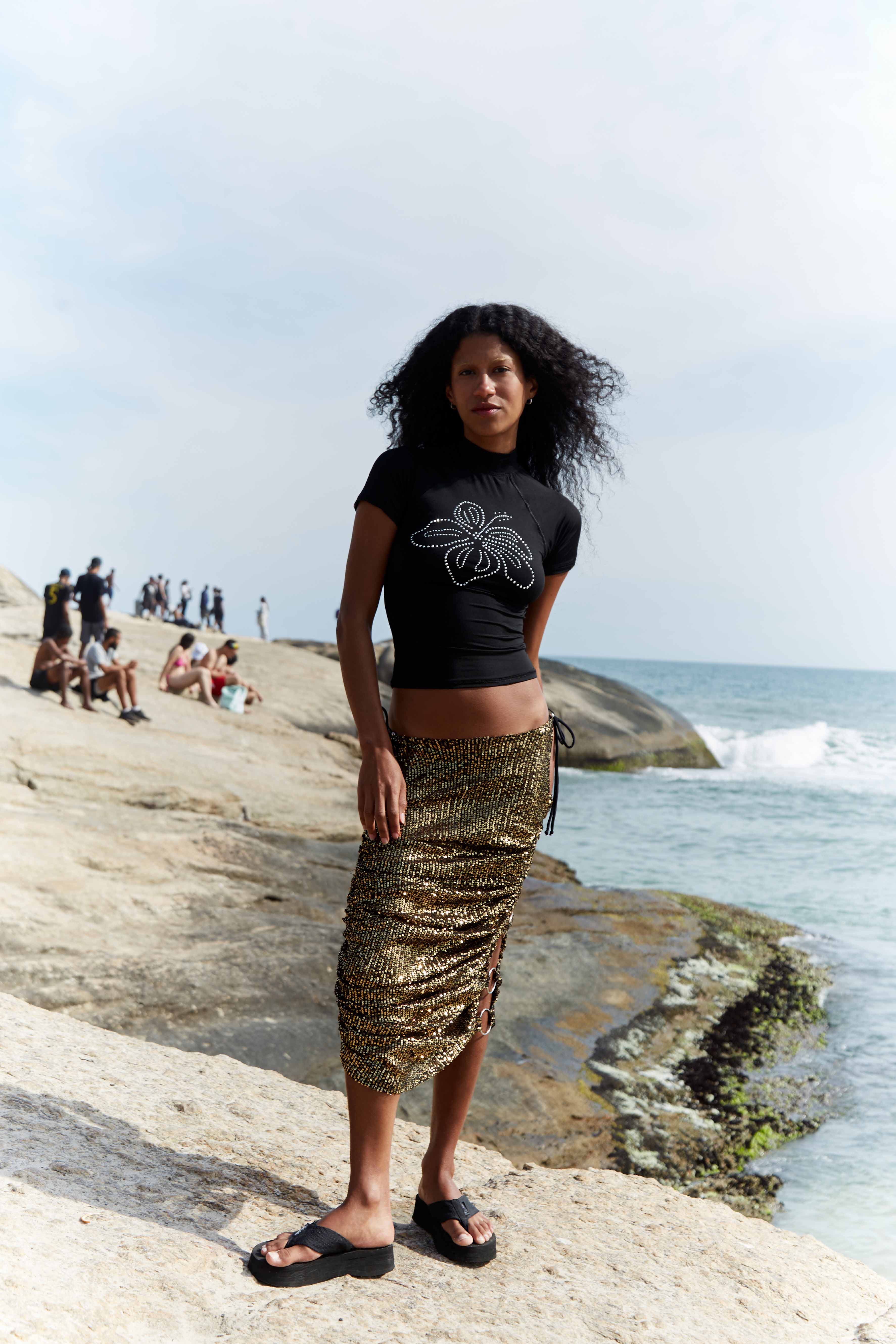 Saia de paetê dourado, de comprimento médio com leve franzido. Possui argolas prateadas nas laterais e amarração no cós para ajuste na cintura. A modelo veste P.