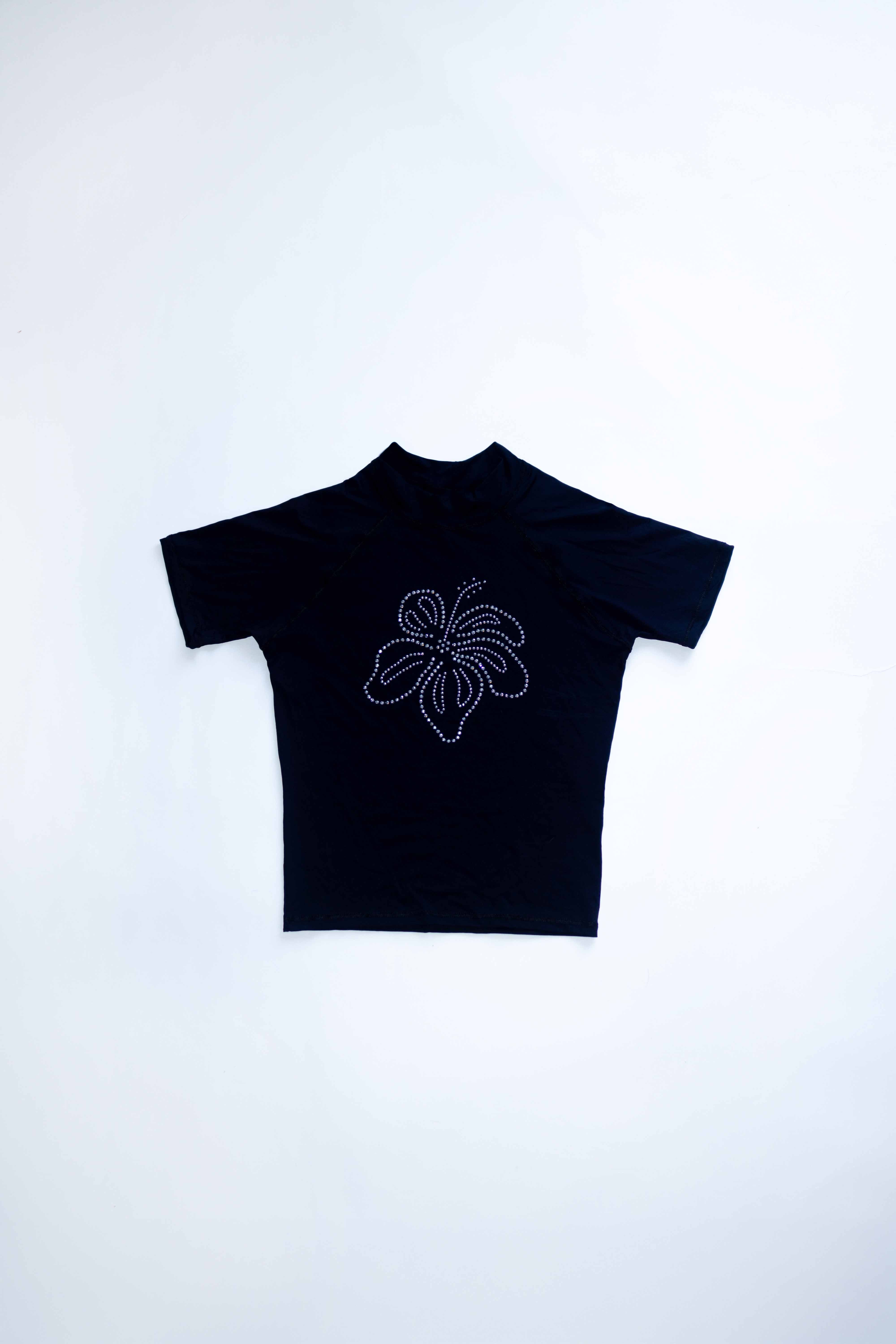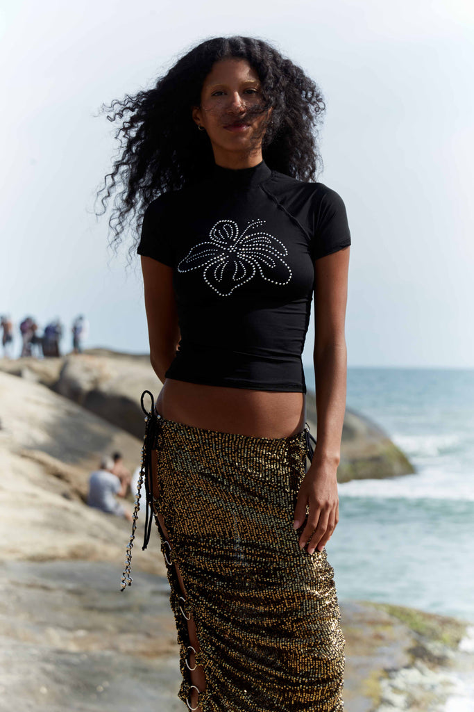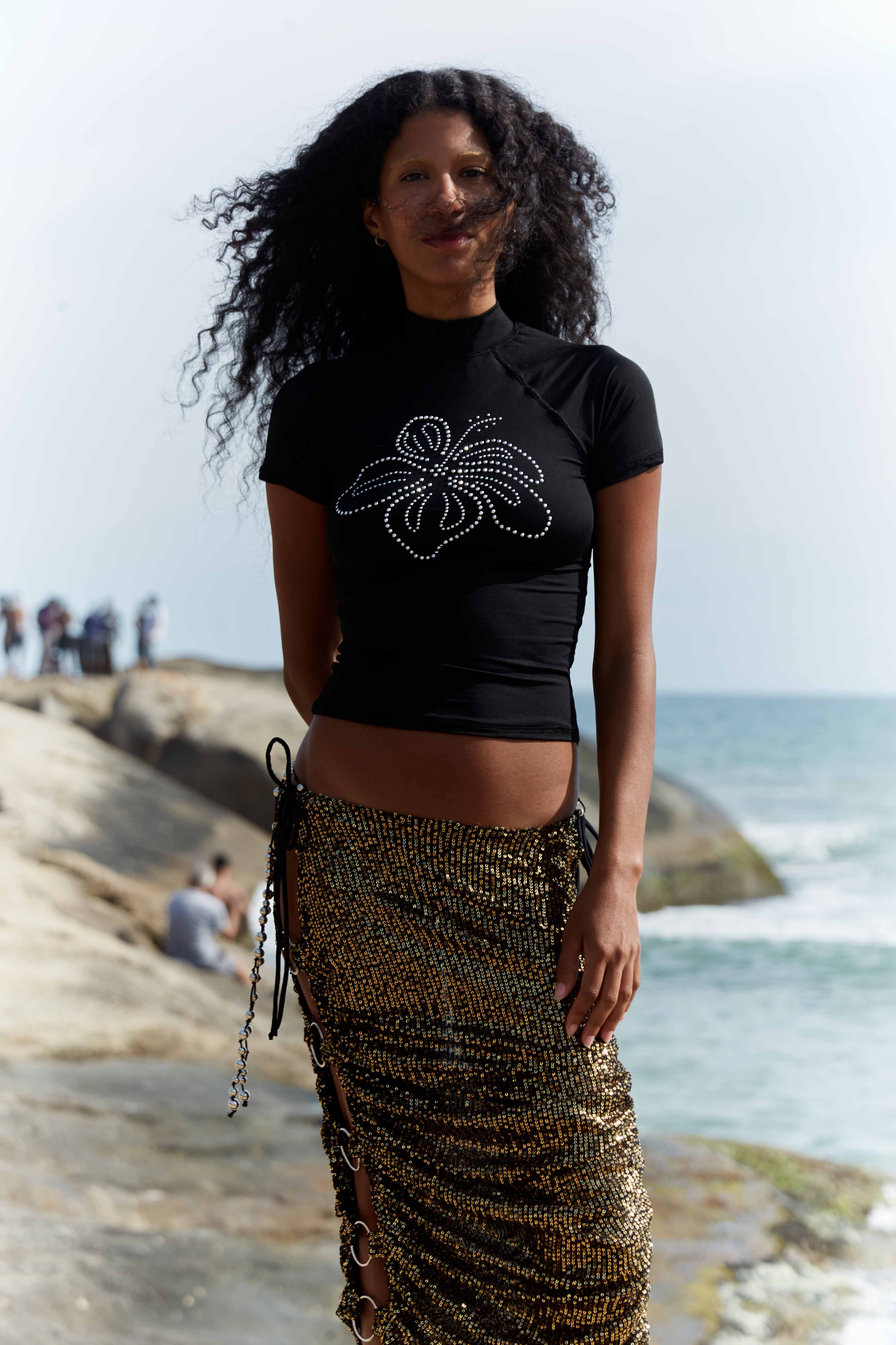 Top com modelagem estilo raglan, detalhe de pesponto de overloque aparente, manga curta e gola alta. Possui aplicação de uma flor de hibisco de strass. A modelo veste PP.