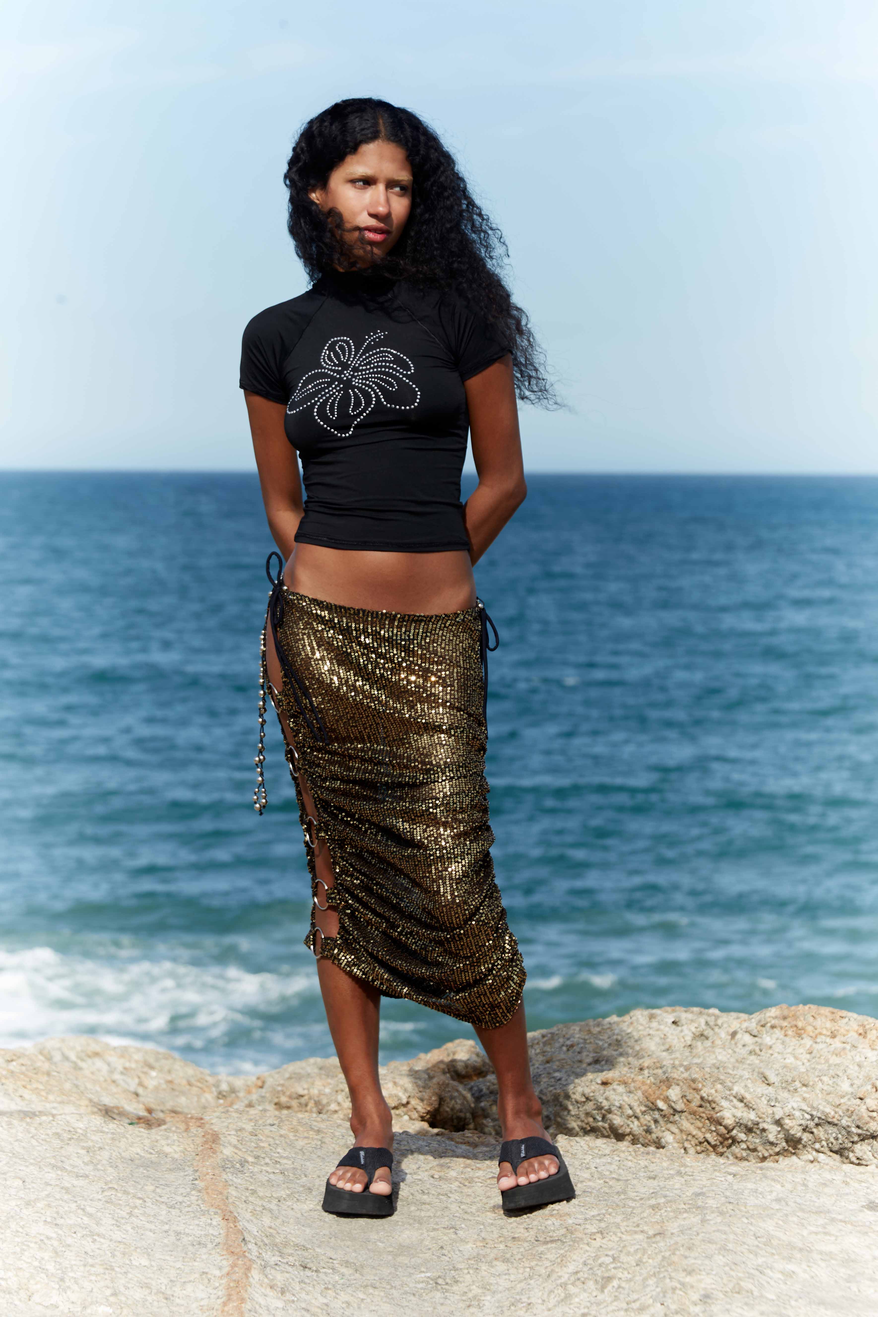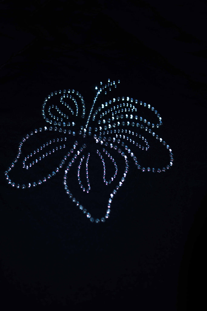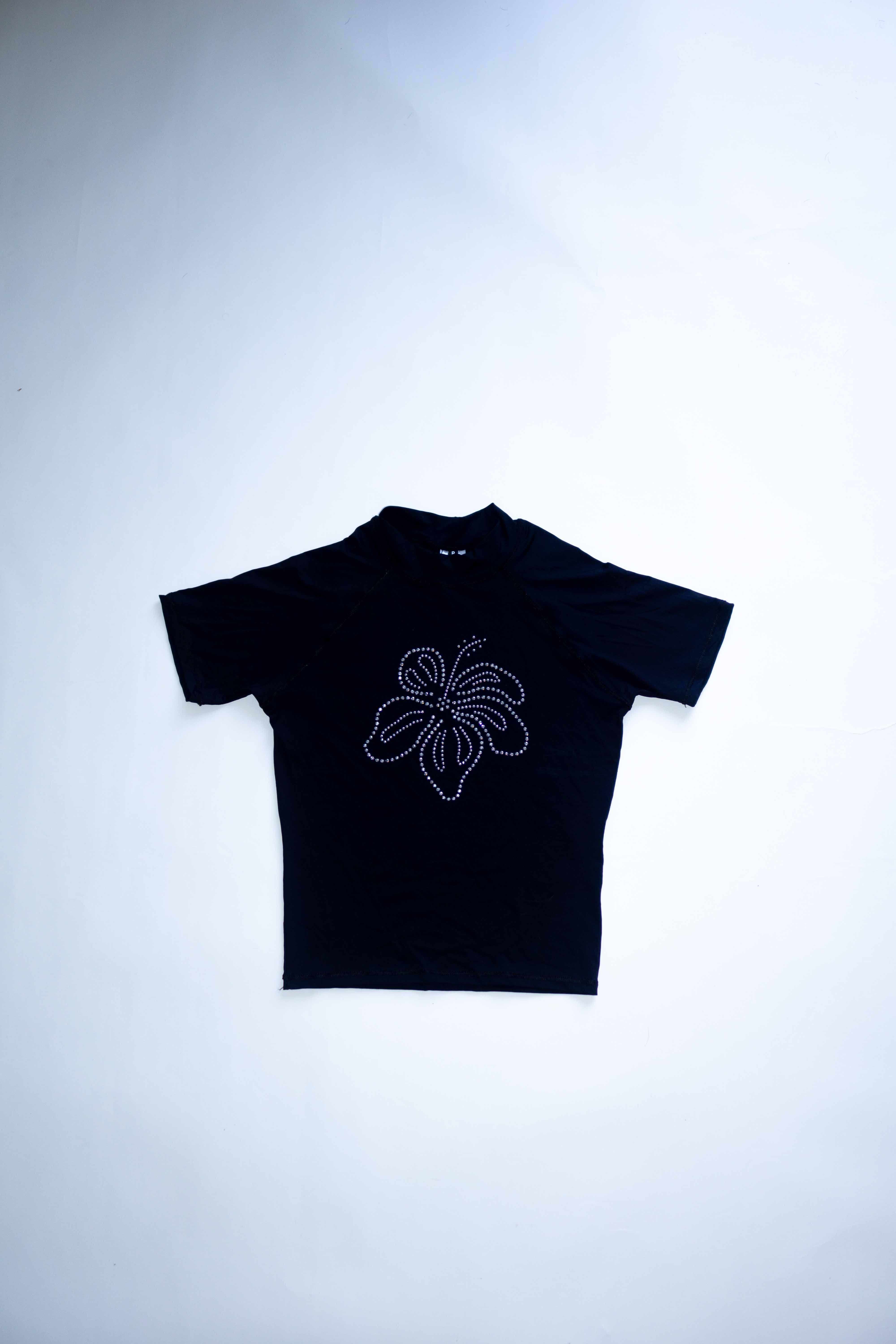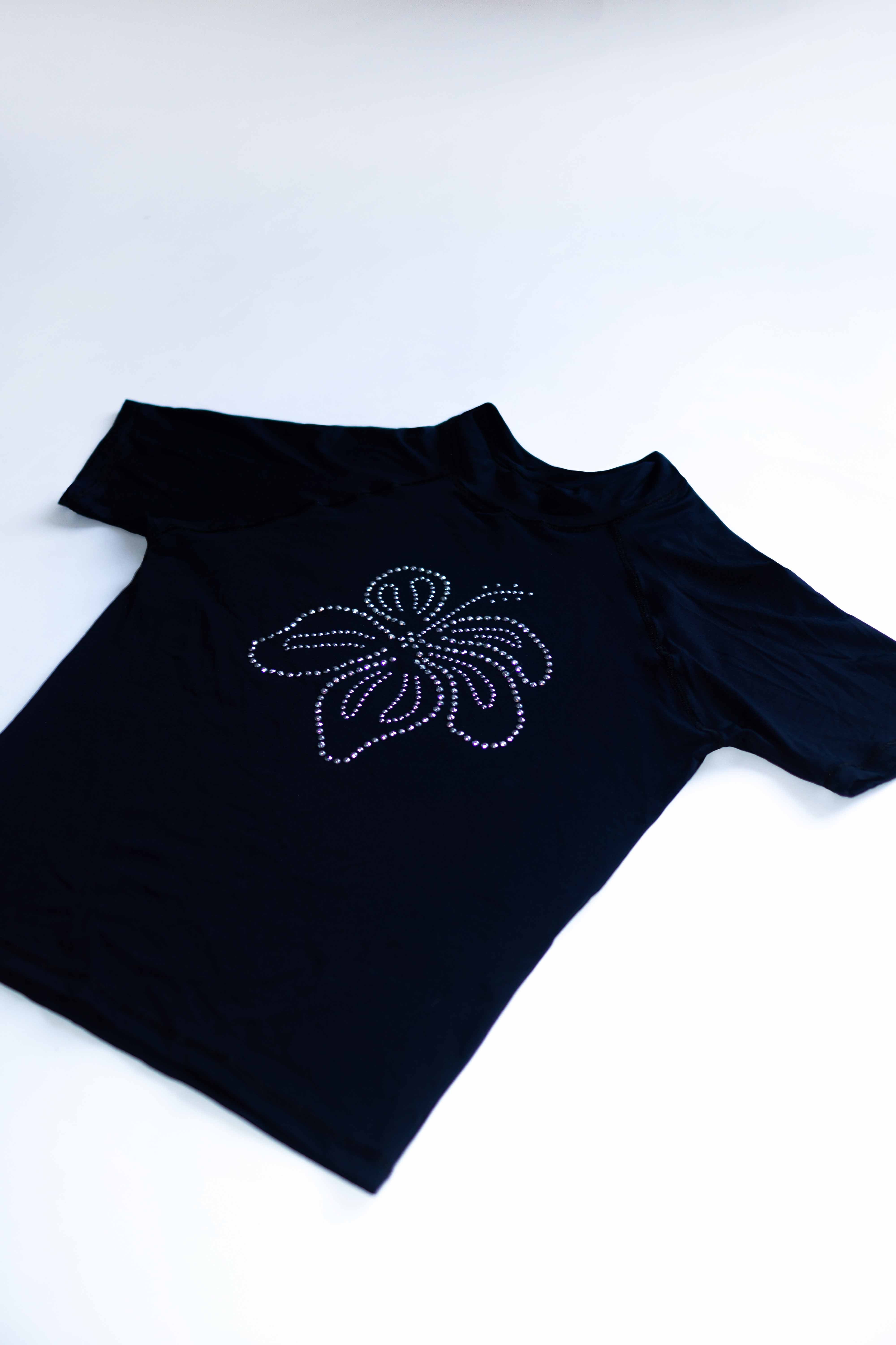 Top com modelagem estilo raglan, detalhe de pesponto de overloque aparente, manga curta e gola alta. Possui aplicação de uma flor de hibisco de strass. A modelo veste PP.