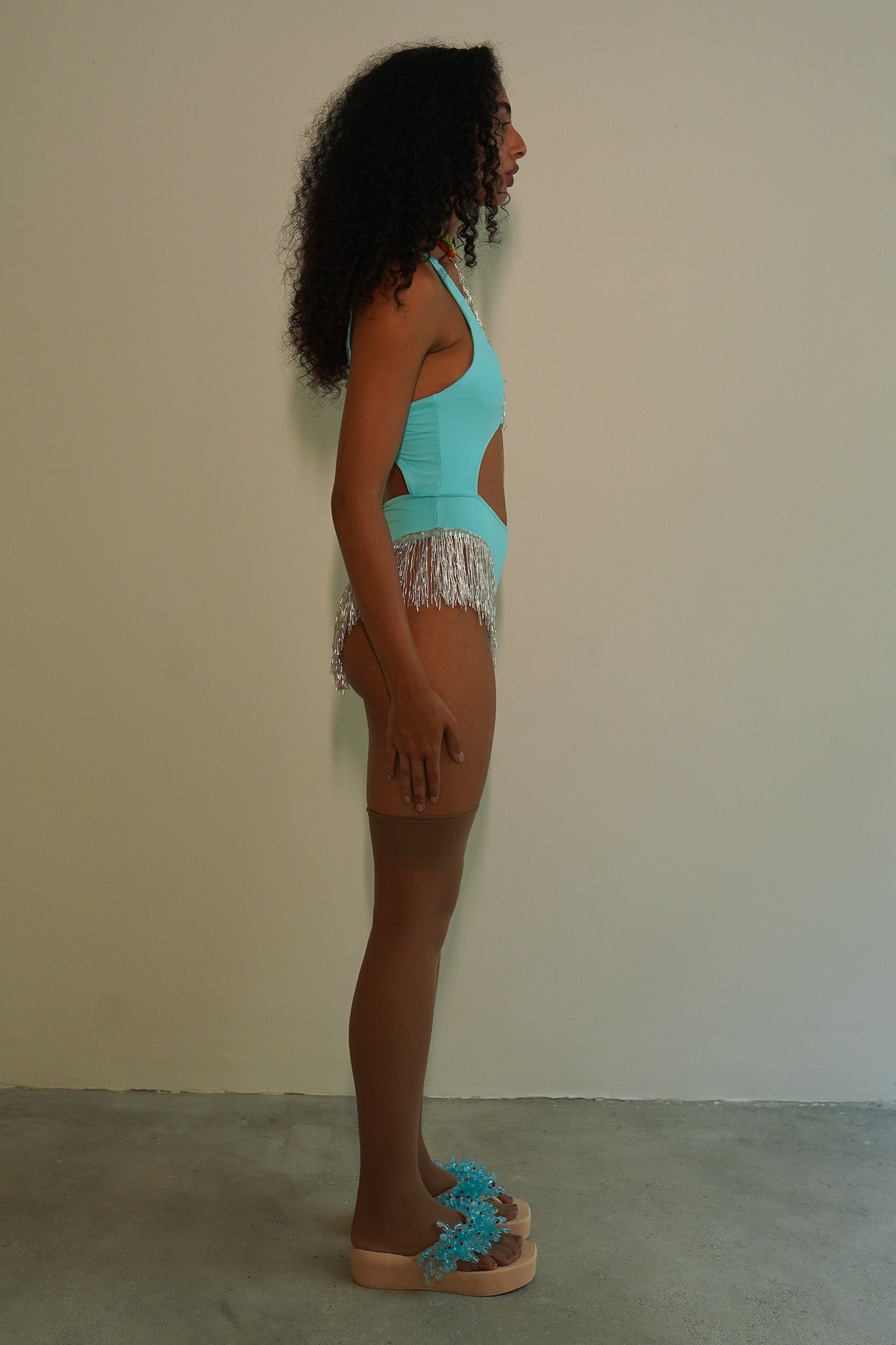 Body de malha azul bebê de decote franzido e recortes, com aplicação de franjas de canutilho prata. A modelo veste P.