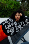 Casaco suéter de tricot com punho ajustado. Possui estampa de fundo preto e desenho de hibisco na cor off white. A modelo veste tamanho P/M.