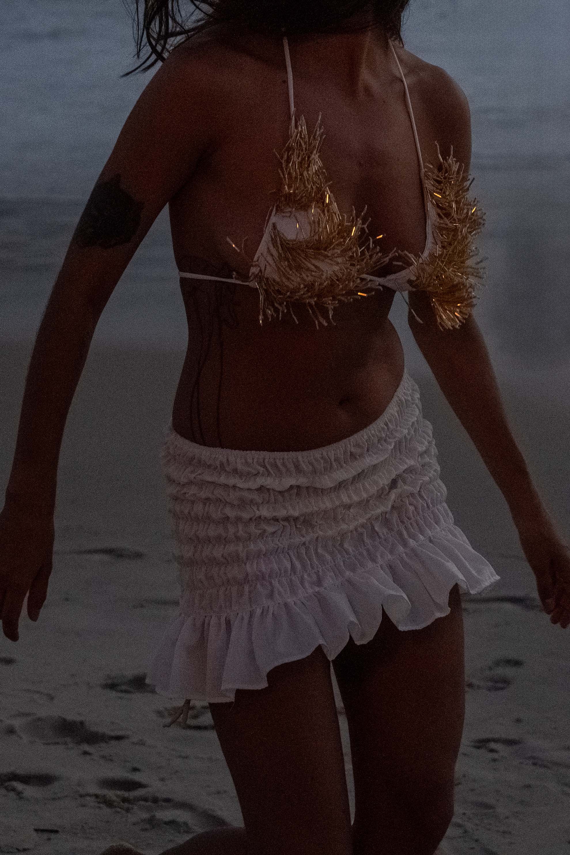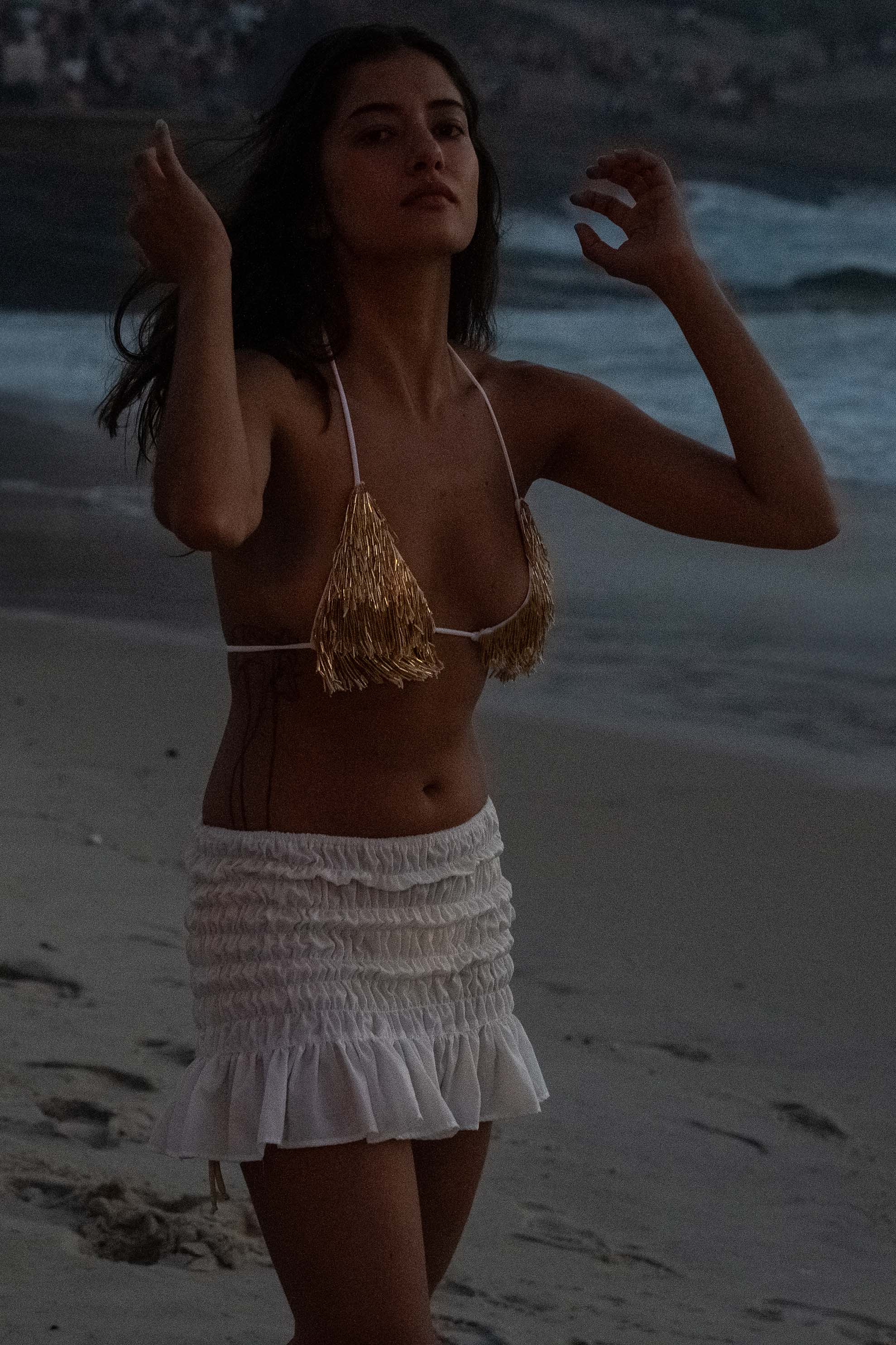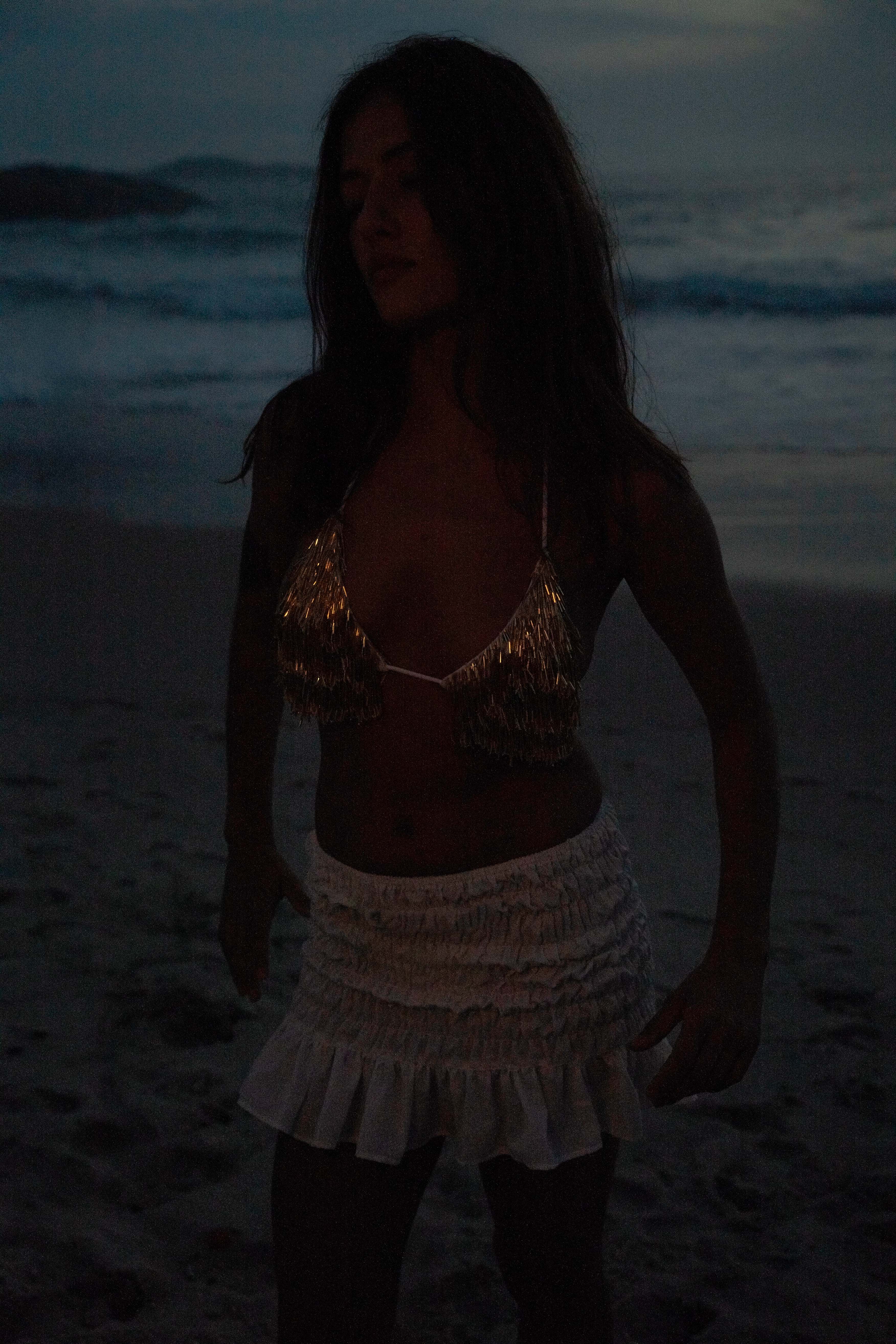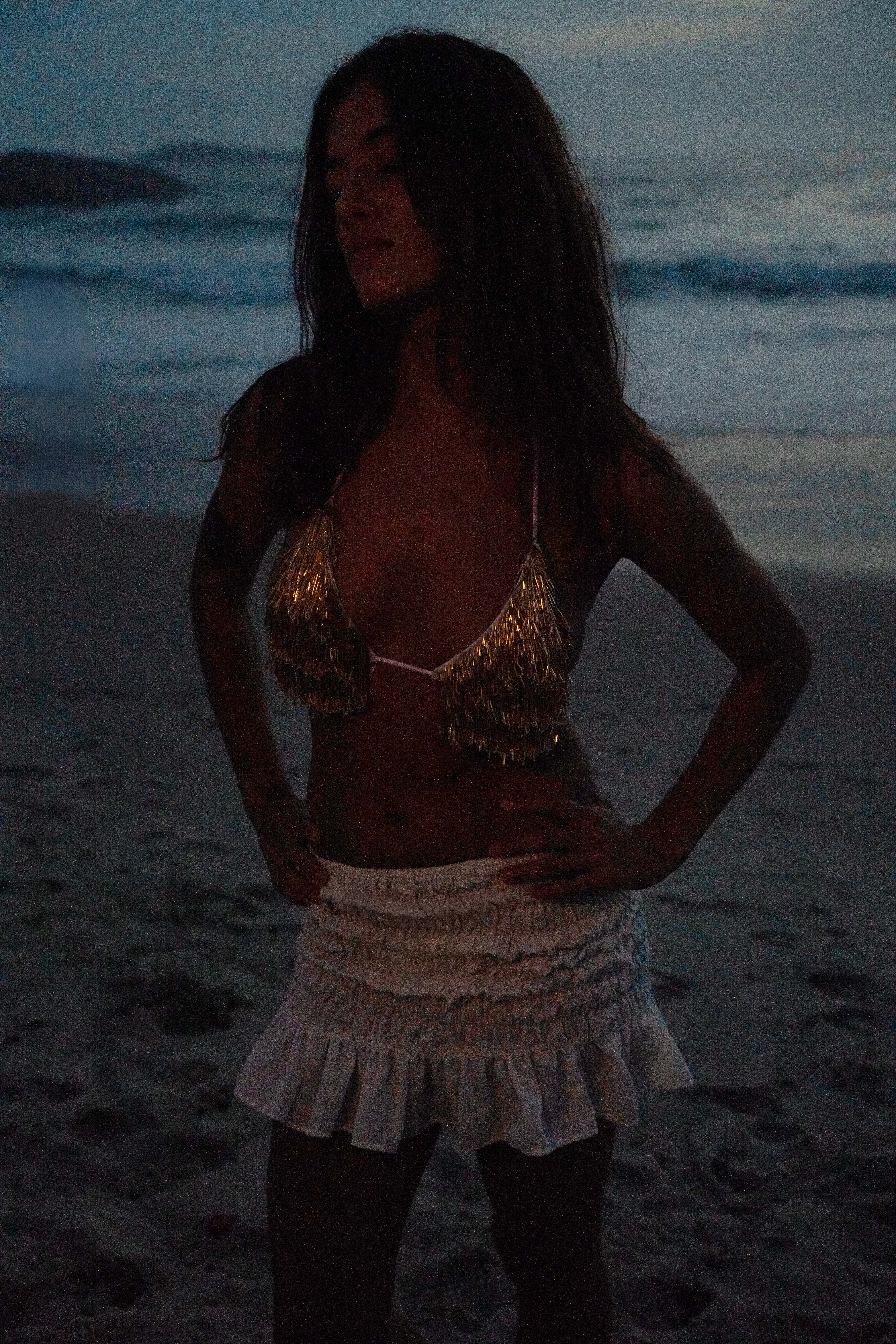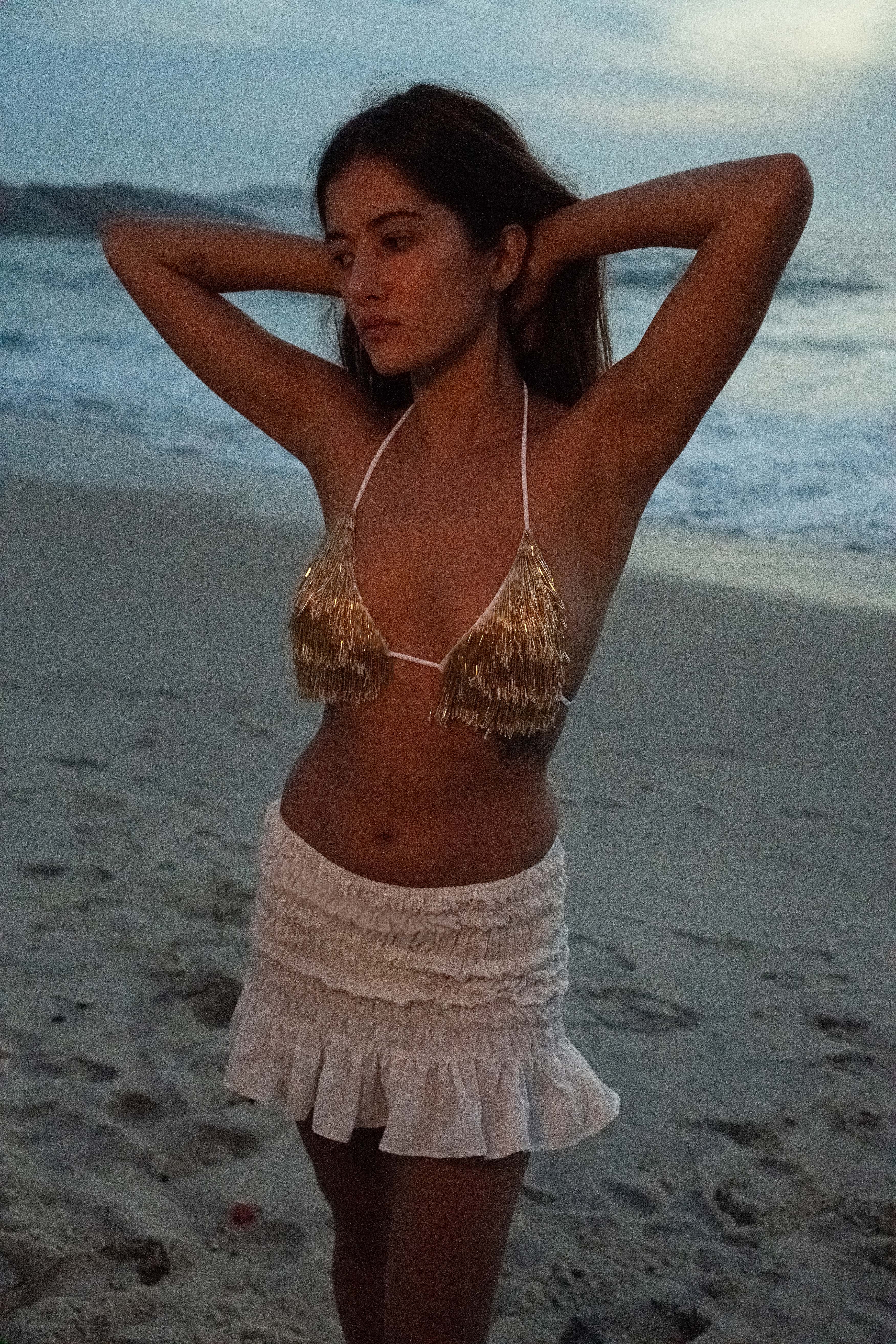 Top cortininha branco com franjas de canutilho dourado, todo bordado à mão. A modelo veste P.