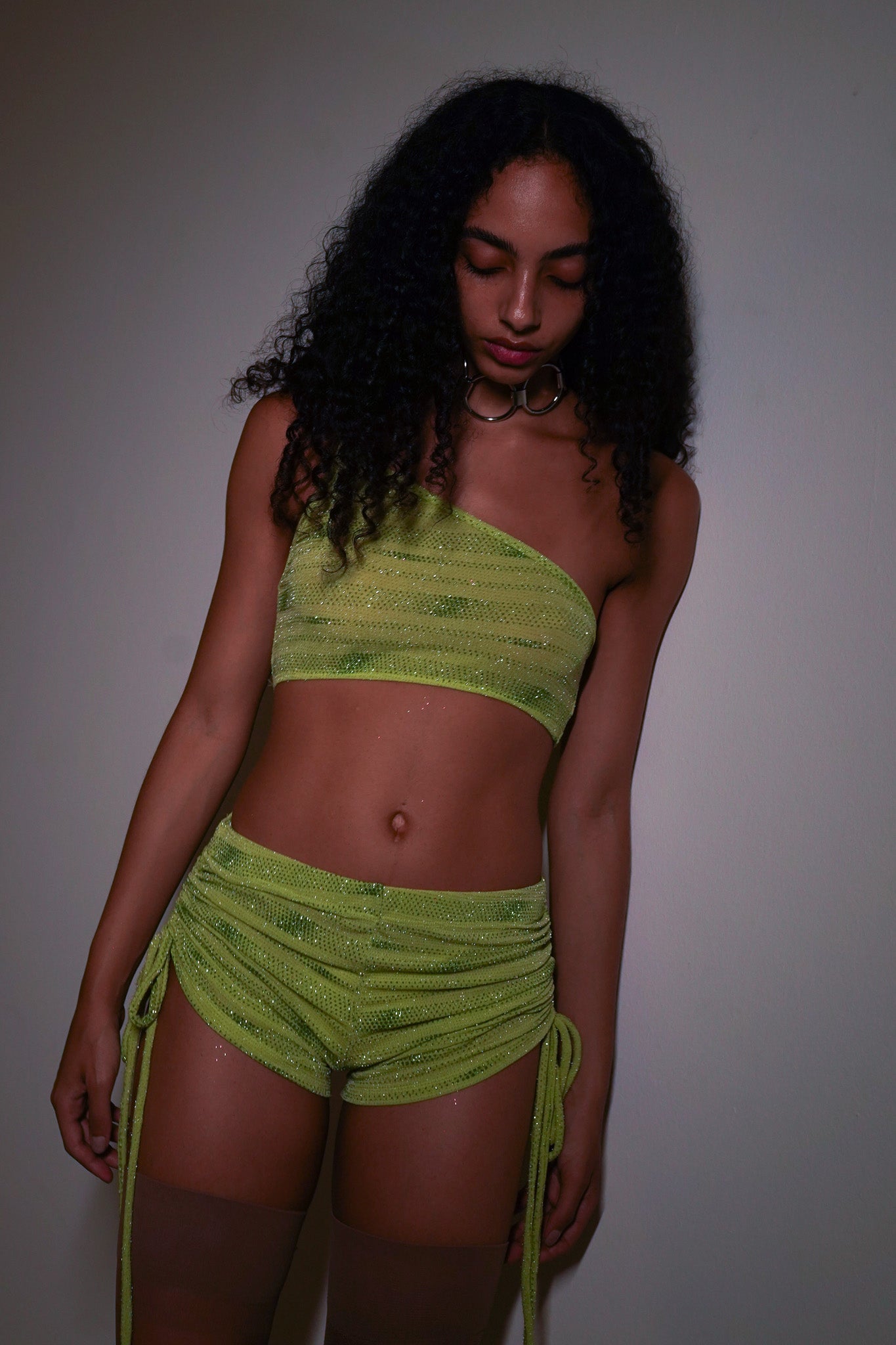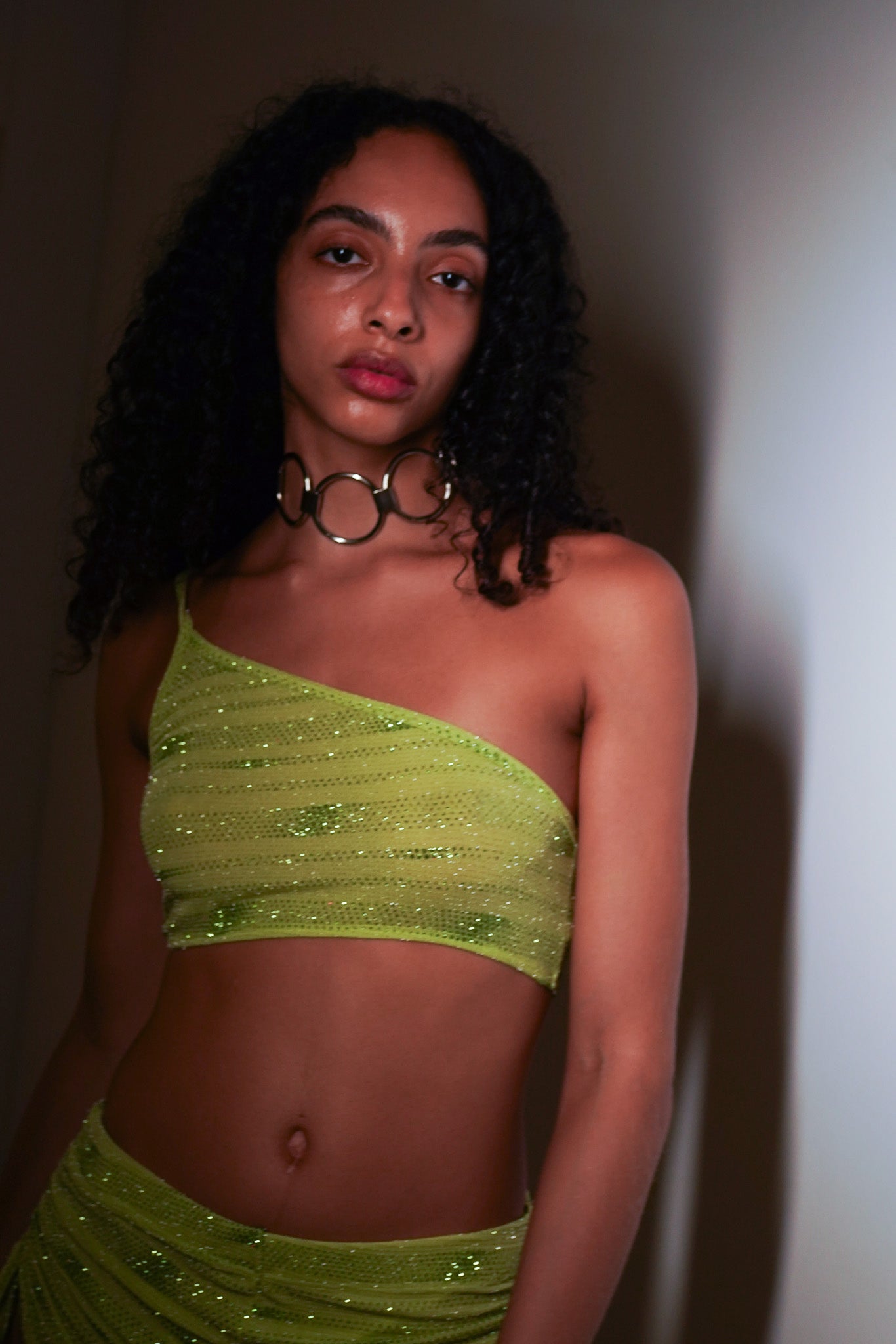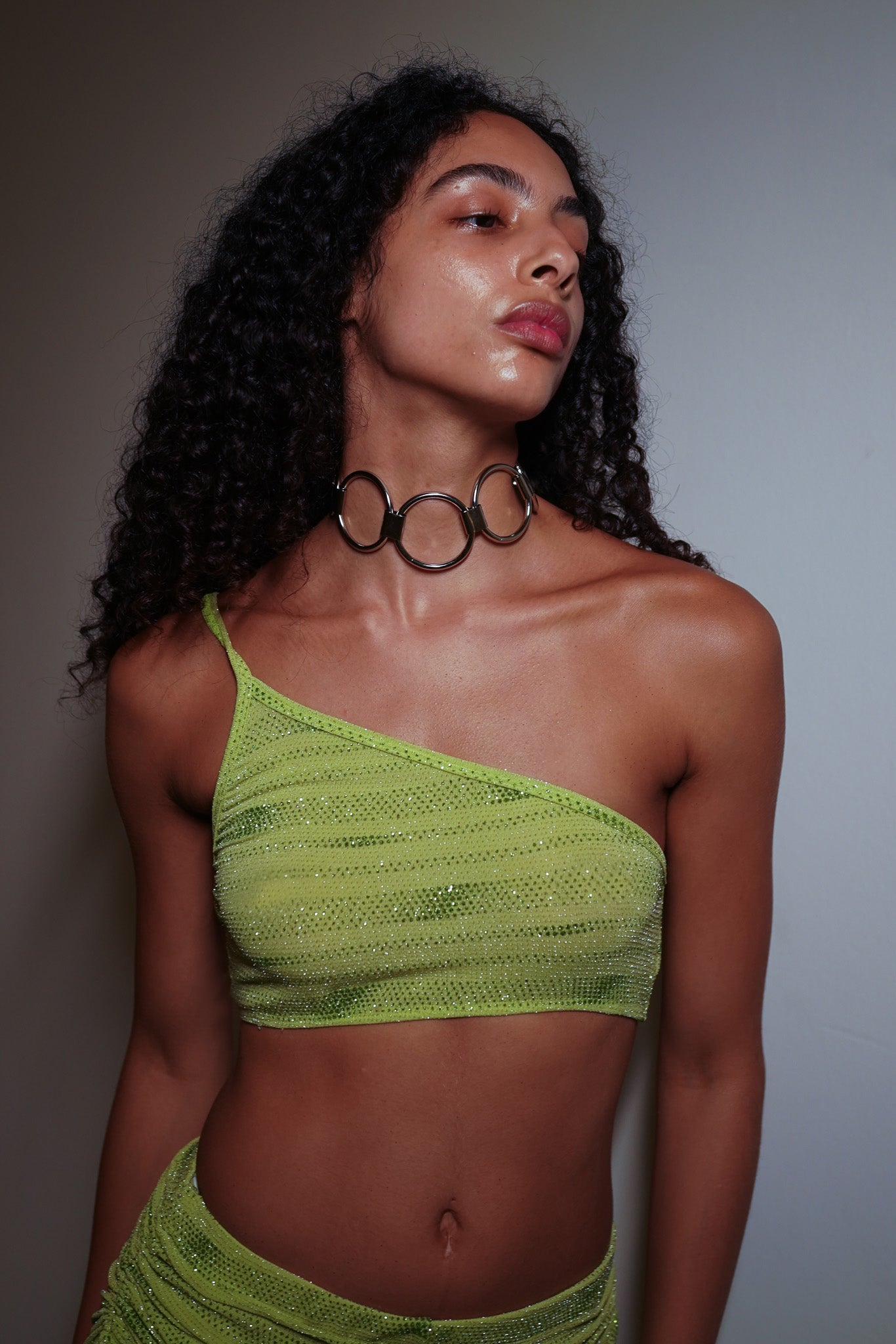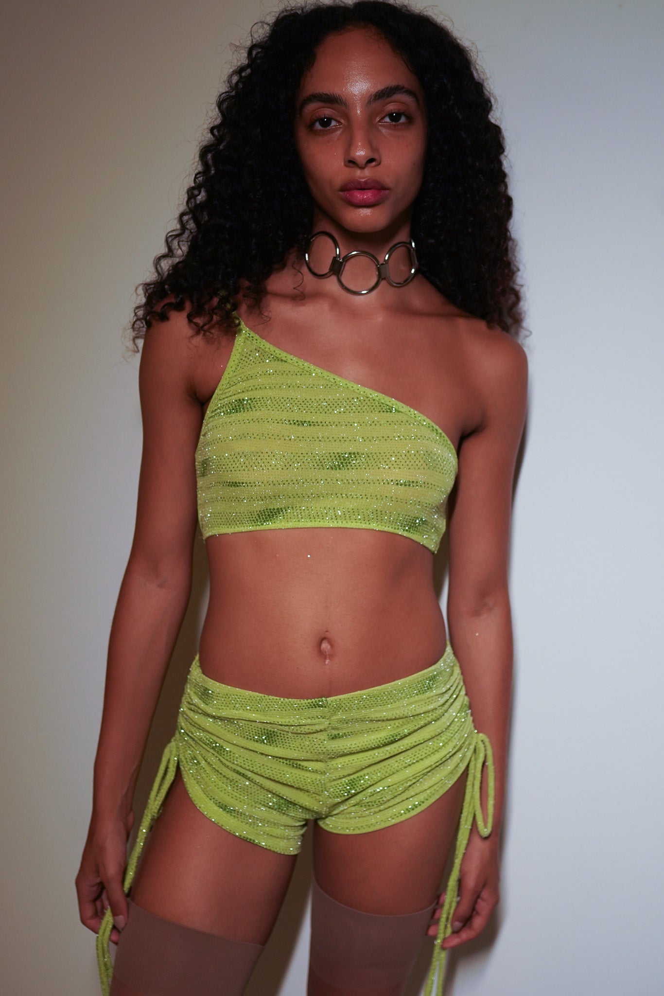 Top de um ombro só, duplo de malha verde com aplicação de glitter. A modelo veste P.