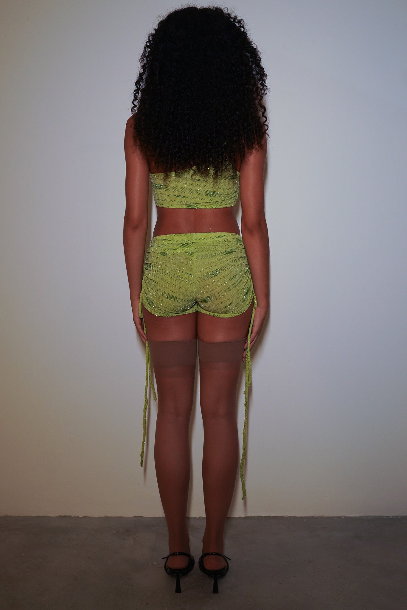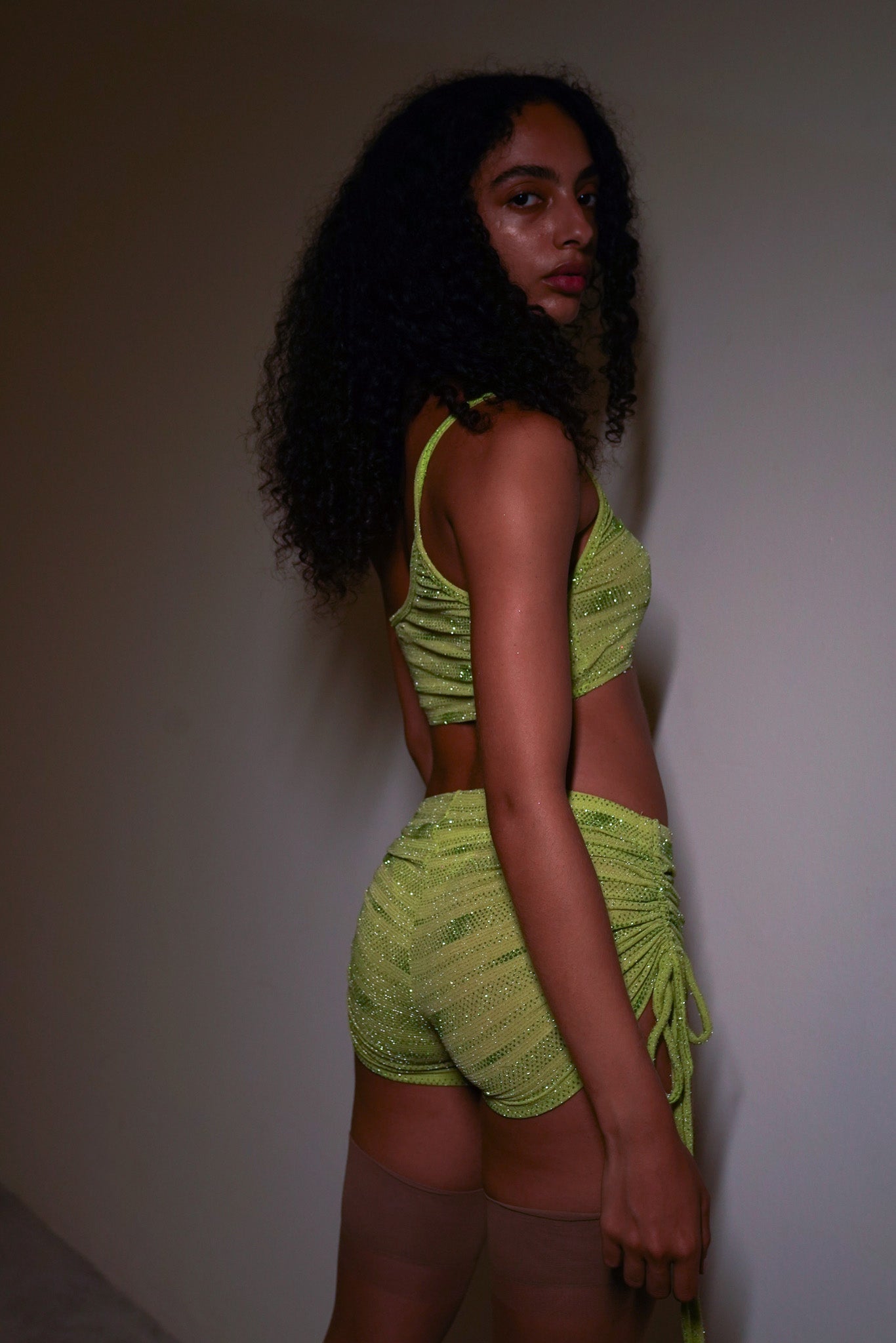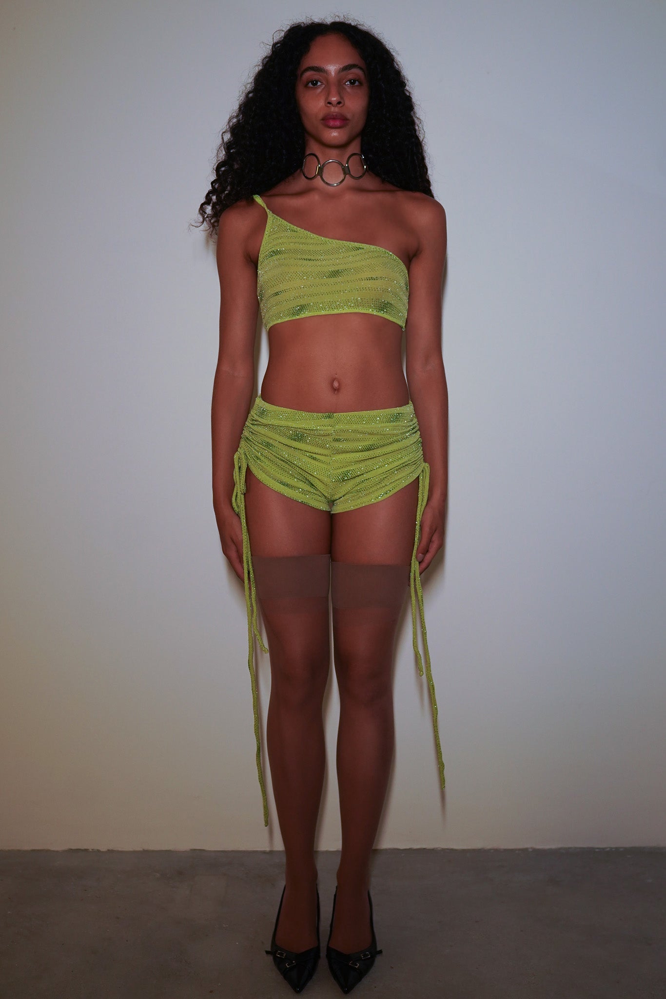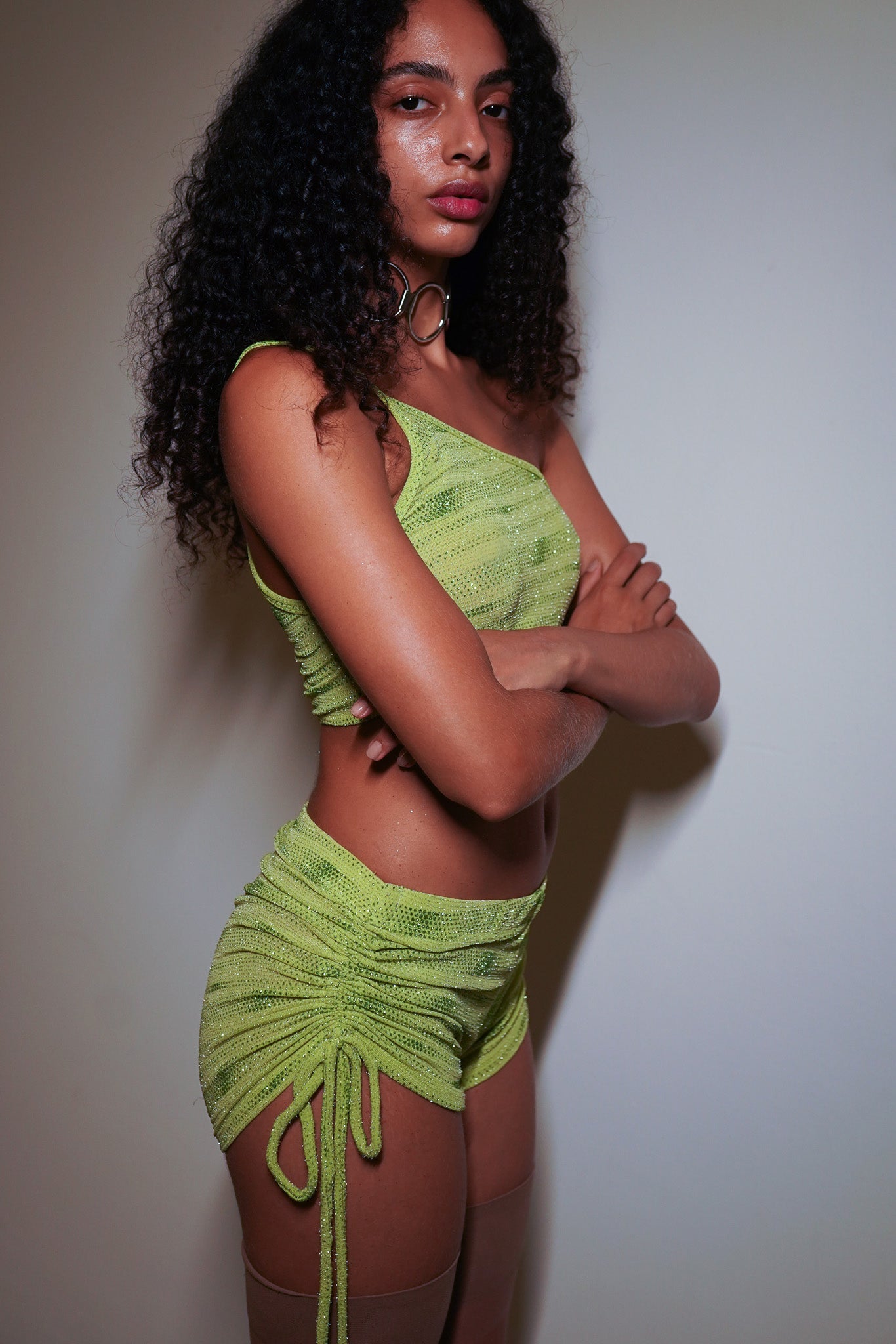 Top de um ombro só, duplo de malha verde com aplicação de glitter. A modelo veste P.